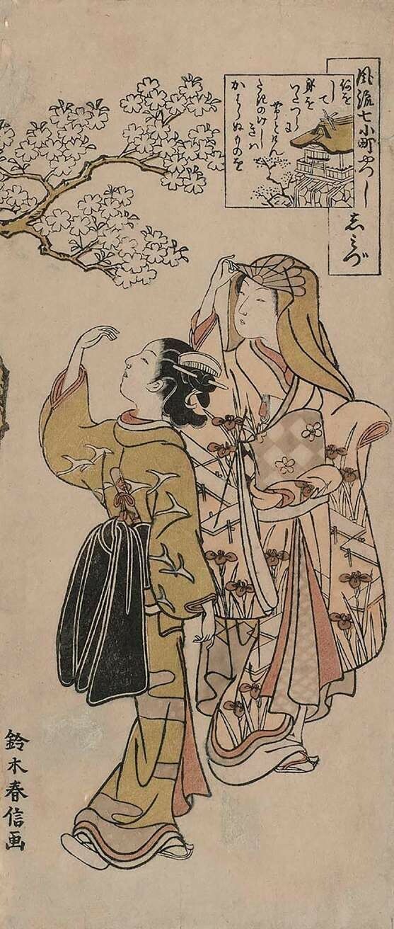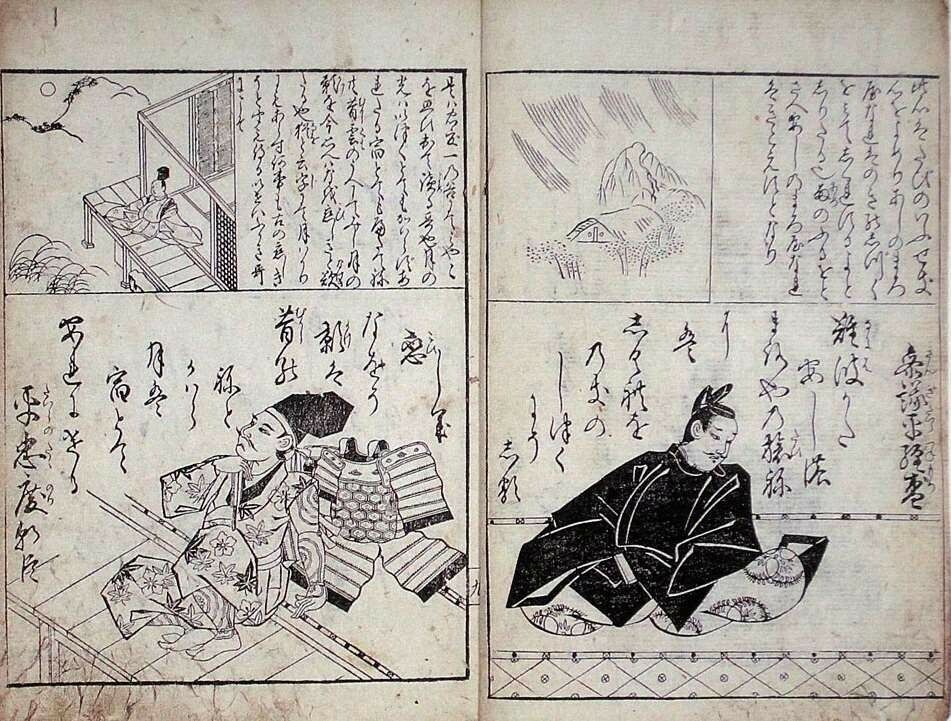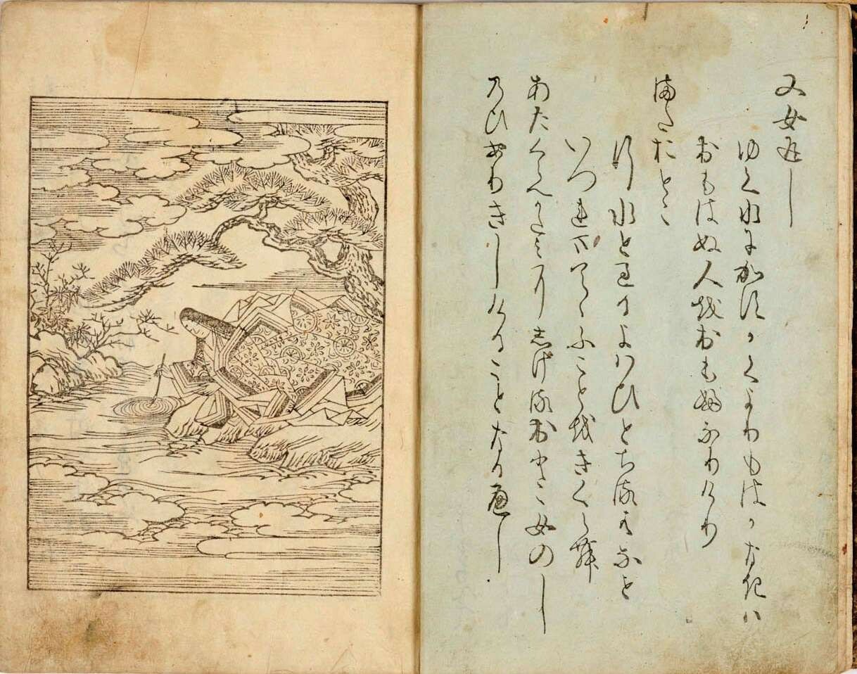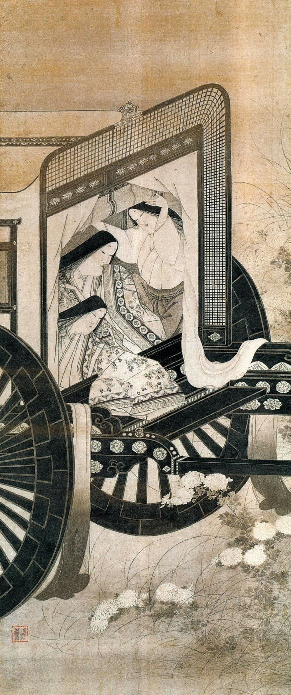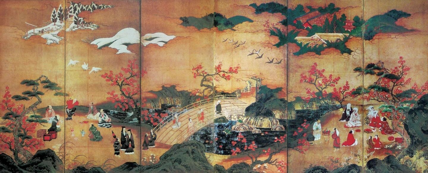 俵屋宗达的艺术继承平安时代华丽的装饰风格,善于借用古典图式并发挥出创造性的天才,为后来浮世绘的“见立绘”样式开了先河。他的经典作品《关屋图屏风》取材于《源氏物语》,辉煌的金色衬底与斜贯画面的青绿山坡相呼应,集中于画面右下端的人物车马刻画入微,透露出精致的工艺感,与抽象简约的整体画面形成强烈对比,由此看到他对《源氏物语绘卷》样式的理解、继承与发展。“青绿的美丽单色占据了画面的大部分,如马蒂斯的平面剪纸般抽象。其形状是简单的,极度抽象化、样式化了的。如果只把那山形提取出来,几乎就是不折不扣的现代抽象绘画。”