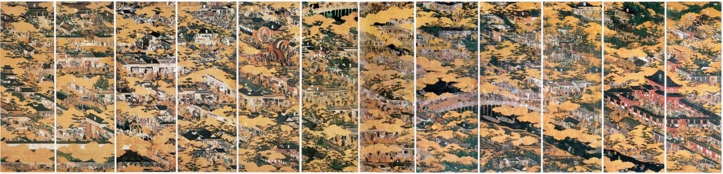《洛中洛外图屏风》的“洛”字是借中国古都洛阳作为京都的别称。日本自从公元8世纪末迁都以来,京都的前身平安京便被称为洛阳城,平安京右城则被称为长安城。“洛中洛外图”是表现京都市区与郊外整体风貌的绘画,从16世纪初开始直到17世纪中期,出现了不同样式,保存至今的仍有70余幅。虽然分别出自各个时期的不同画师之手,但基本上都沿袭相同的图式结构。画面上方三分之一是郊外景色,下部三分之二是市区。画师将中国画的散点透视、“三远法”等与日本绘卷的斜线俯瞰透视手法融为一体,巧妙地熔京都市区和郊外主要景点于一炉。同时,一如日本人对自然的敏感,画面还十分注重对季节的表现,一般由左至右可见一年四季景色的推移,梅花、桃花、田野、秋麦、杨柳、收割、红叶、雪山、祇园祭、盂兰盆节等。详细描绘京都市区的景象,神社寺院与诸侯宅邸、平民街区交错,生动穿插民生百态,包括贵族、武士、僧侣、商贩、巡捕、法师、艺人、乞丐各色人等。值得注意的是,画面还描绘了“游女町”(游女意为妓女)、歌舞伎屋等新兴城市的游乐场所,显露出后来浮世绘的主题。画面不仅全面反映了当时京都的城市面貌,更重要的是体现了新兴市民阶层的活力,颇有北宋张择端《清明上河图》的风采。