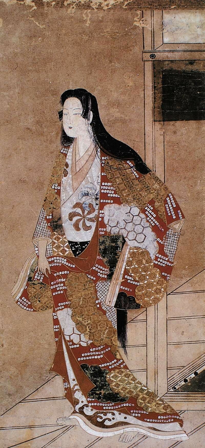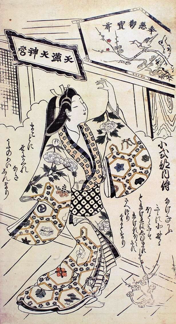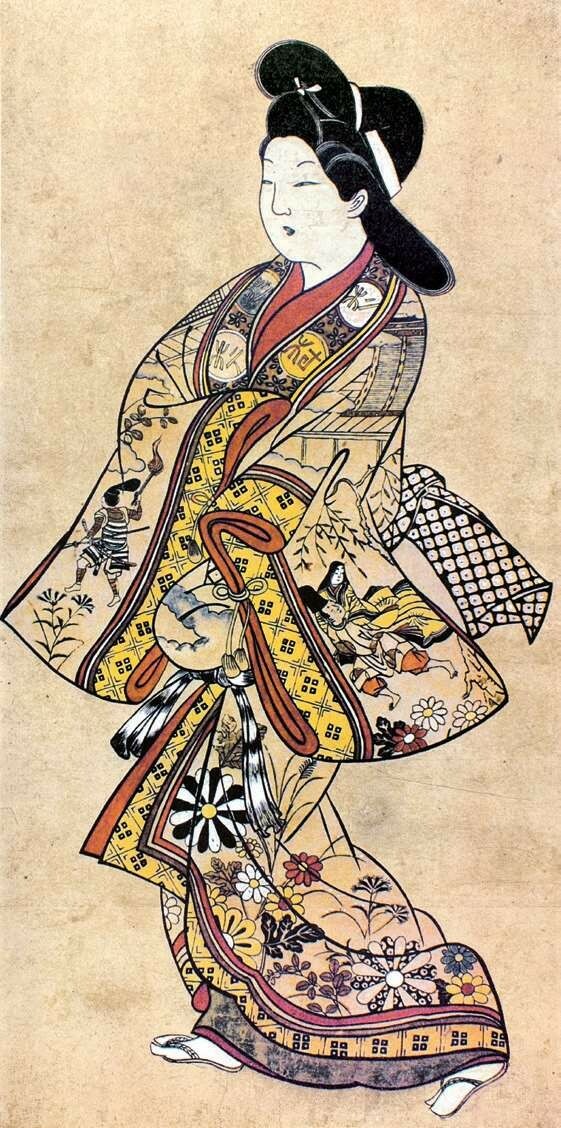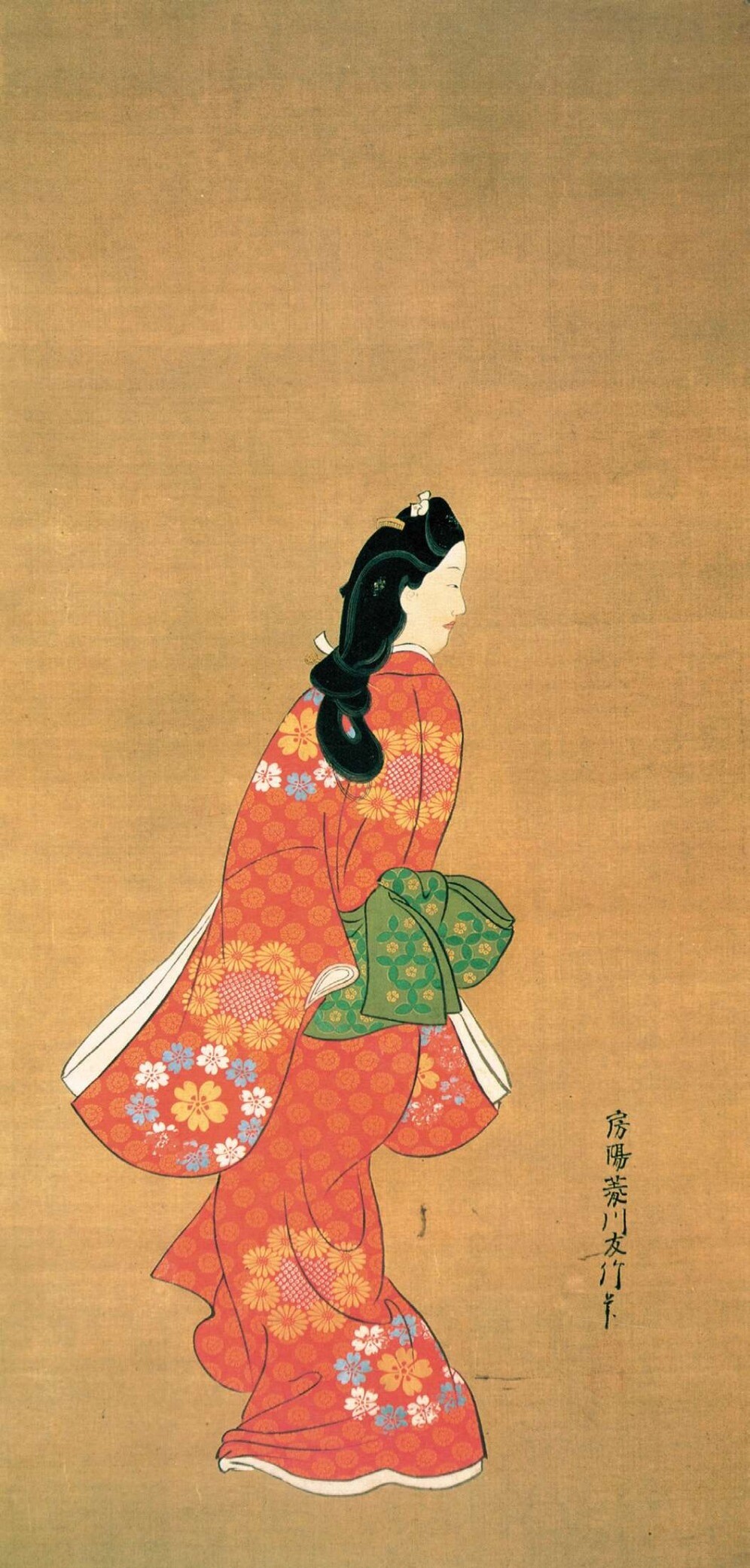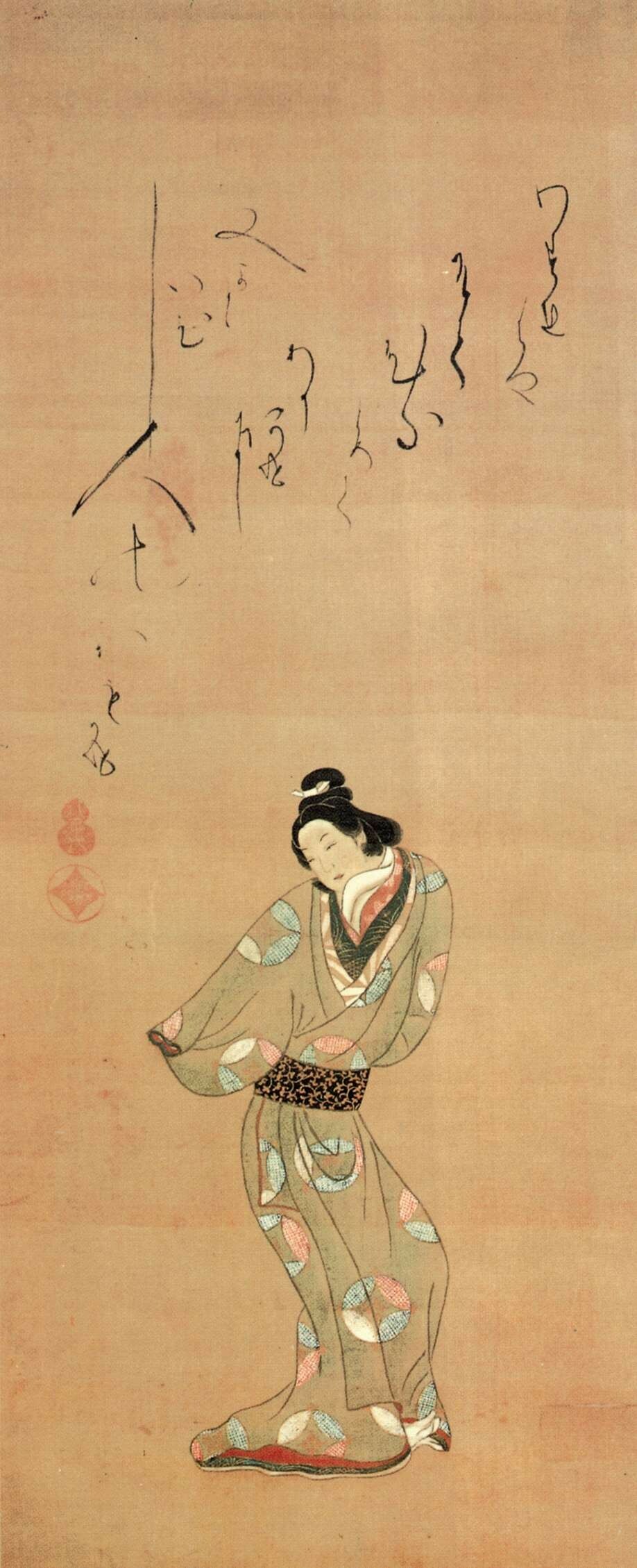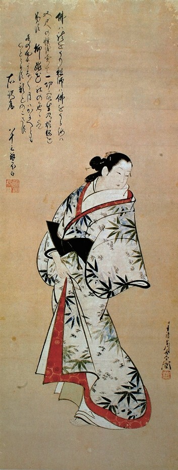 挂轴美人画也称“手绘浮世绘”,现存最早的作品为《缘先美人图》,画面是一位站立在屋檐下的女性,据考借鉴了《伊势物语》的造型及技法,源自古典手法的美人图开始向浮世绘演变。这种单人的美女立像被冠以其流行的宽文时代(1661—1672)的年号,称为“宽文美人图”,自17世纪中期开始持续了约50年,其细腻的手法逐渐成为一种样式被固定下来,并衍生出多种表现形式。