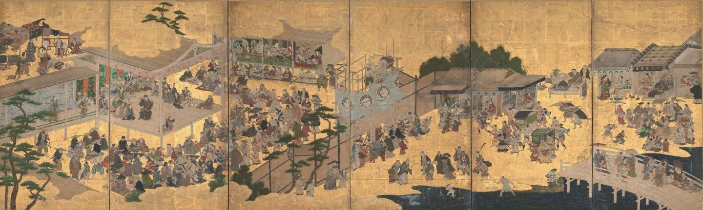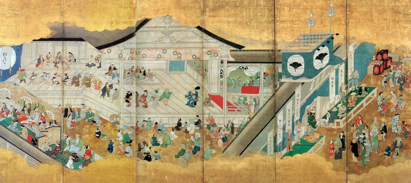 当时流行的歌舞伎表演者以服装新奇著称,博得广泛人气。《洛中洛外图屏风》中描绘了最初的歌舞伎舞台,后来出现独立的歌舞伎图屏风,也是当时的一个重要风俗画主题。现存最早的《女歌舞伎图屏风》据考为17世纪10年代(庆长年间)所作,表现了当时在茶屋里游乐的场面。《吉原风俗图卷》除了出现手持传统乐器“三味线”的游女歌舞伎外,还有对各式各样杂耍艺人的描绘。《祇园祭礼图屏风》以豪华细腻的描写体现宽承时期的风格,较之对祭典的表现,对人物表情和动态的关注更引人注目。
