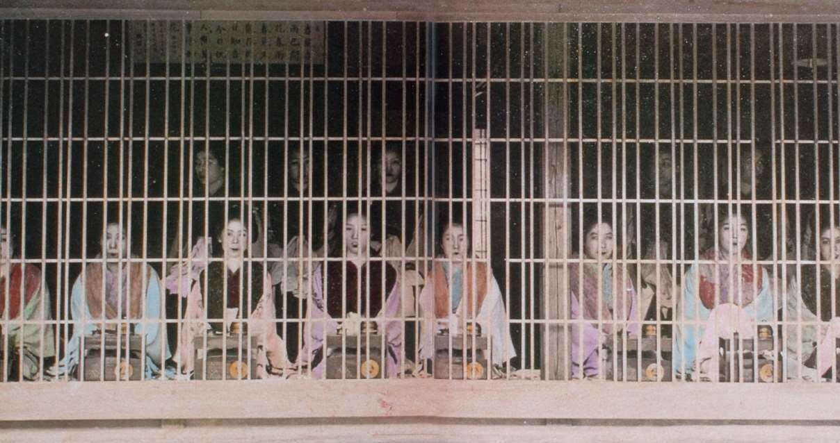 吉原妓女端坐在沿街的栅栏后面招揽游客,日语称为“张见世”。(摄于1900年,原载于:小西四郎等編『百年前の日本』、小学館、2005。)