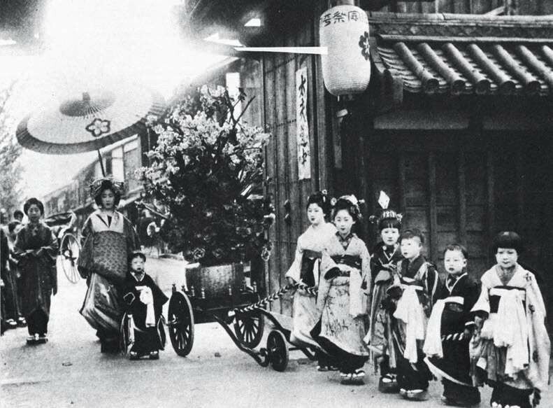 “花魁道中”是花魁的出行仪式。上图为当年京都岛原花魁出行的真实情景,花车开道,侍从前呼后拥,场面奢华。现已作为民俗景观保留下来。