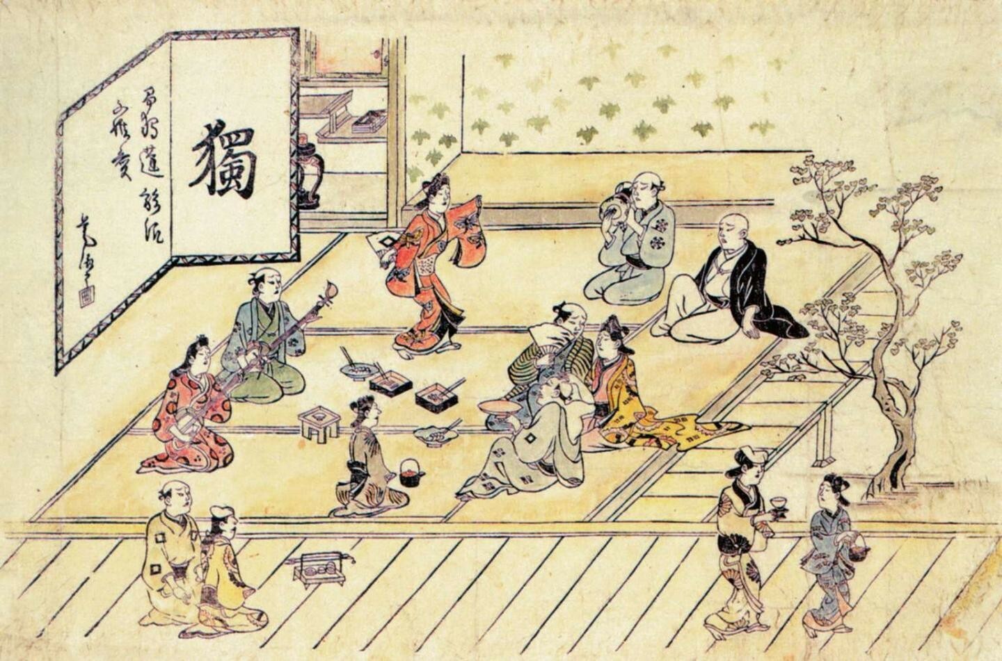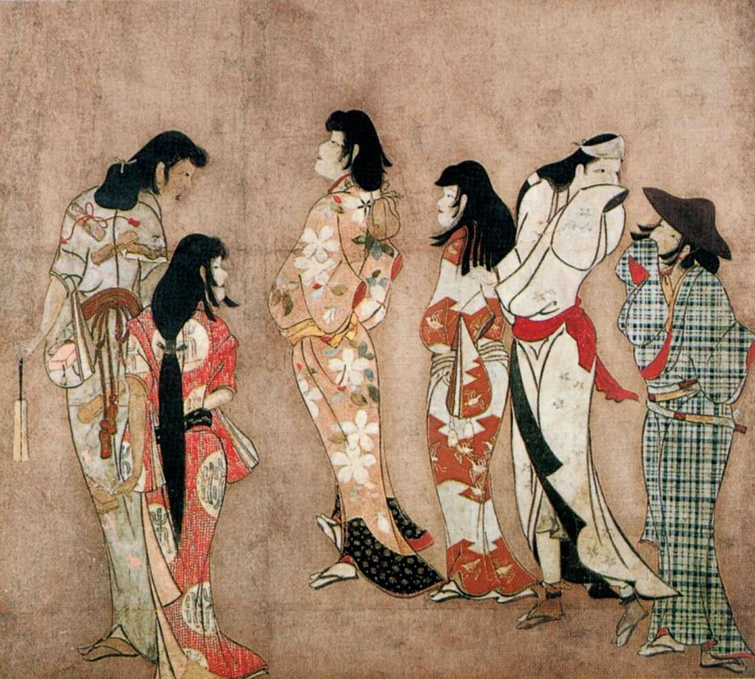 除了政府公许的吉原之外,江户还有多处私下经营的色情街区,日语称为“冈场所”。《汤女图屏风》原为四折屏风画,据考右边应还有一组男性群像。这是一群当时在温泉澡堂里打工兼事色情业的女子,左起第二人身上的“浴”字表明了她们的身份。线条流畅、造型简洁的美人图,洋溢着活泼的生命感。由此可见风俗画不仅描绘开放的世俗行为,在追求故事性的同时也以表现女性美为主。以宽永时期为中心的风俗画开始出现初期手绘浮世绘,这不仅与歌舞伎和游廓的主题有共通性,还有表现现实女性美的共同追求。宽永时期的《舞踊图屏风》,一扇屏风描绘一个人物,后来挂轴画中的单人美女图即由此演变而来。