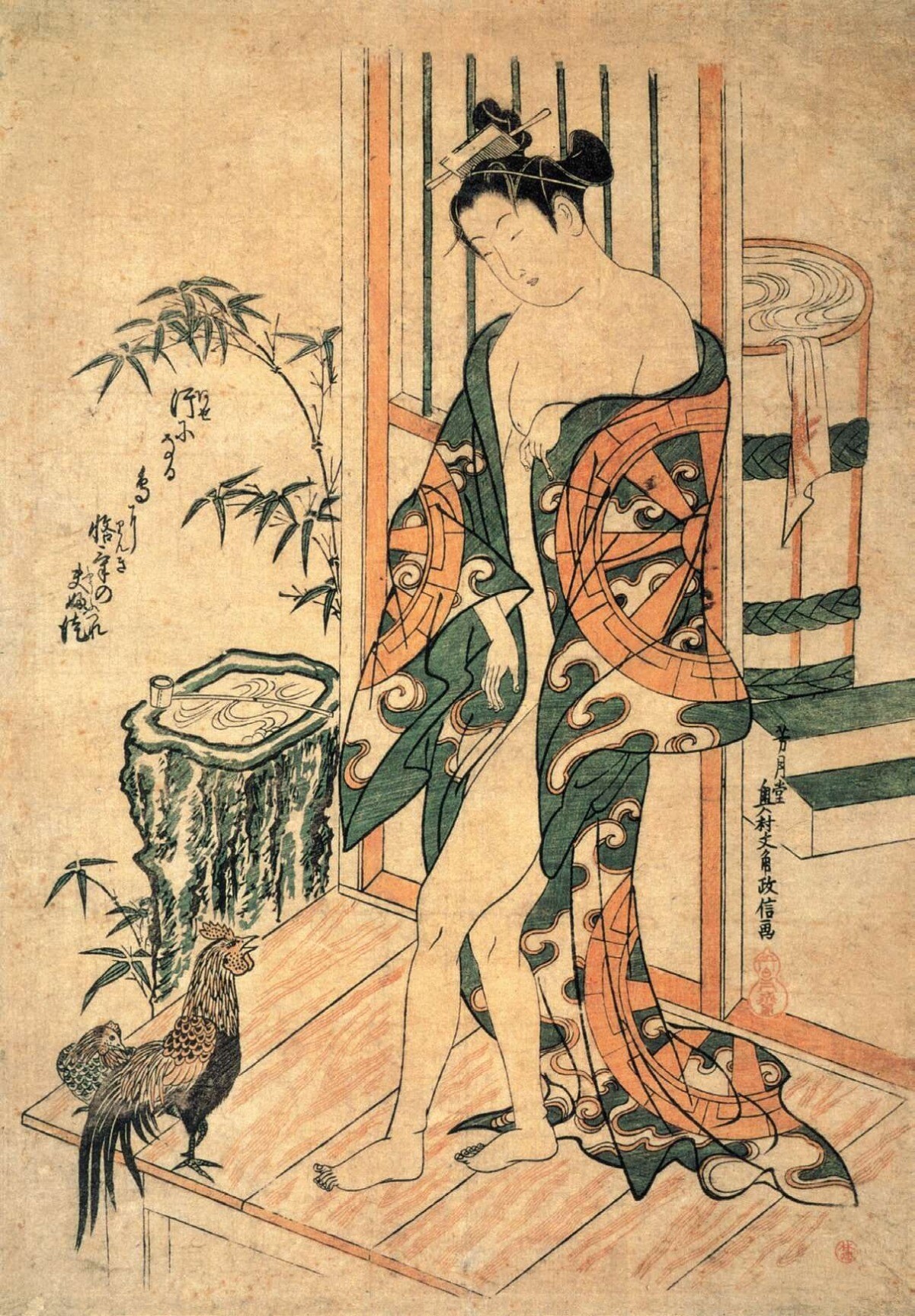 《妇人相学十体 浮气之相》画中是一位花柳街的女子,出浴后用手帕擦手,衣着不整,所谓“浮气”(意为“心思不专”)正是对她身份的真实体现。可见铃木春信的柔弱少女时代已经结束,也不同于鸟居清长的理想美,对人物性情细致而生动的刻画宣告了歌麿美人画时代的到来。