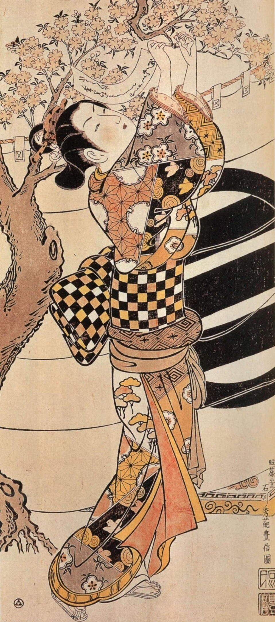 《妇女人相十品 吹“噗乒”的少女》,“噗乒”是江户时代从中国进口的一种轻便易碎的玻璃小玩具,随着气息的吹拂会发出“噗乒噗乒”的声响,由此被称为“噗乒”,在民间广泛流行。喜多川歌麿的美人画就多次描绘了吹“噗乒”的女子。画中少女看上去是个富家子女,和服的格子花纹是江户时代流行的两色正方形(或长方形)交替配置的花纹,在上古时代的陶俑服装与奈良法隆寺和正仓院的染织品中就能看见。江户时代的歌舞伎演员佐野川市松因在舞台剧中穿着白色和藏青色的方形图案服装而博得人气,由此以他的名字命为“市松模样”,成为江户时代最有代表性的图案,也称“市松格子”“元禄模样”。