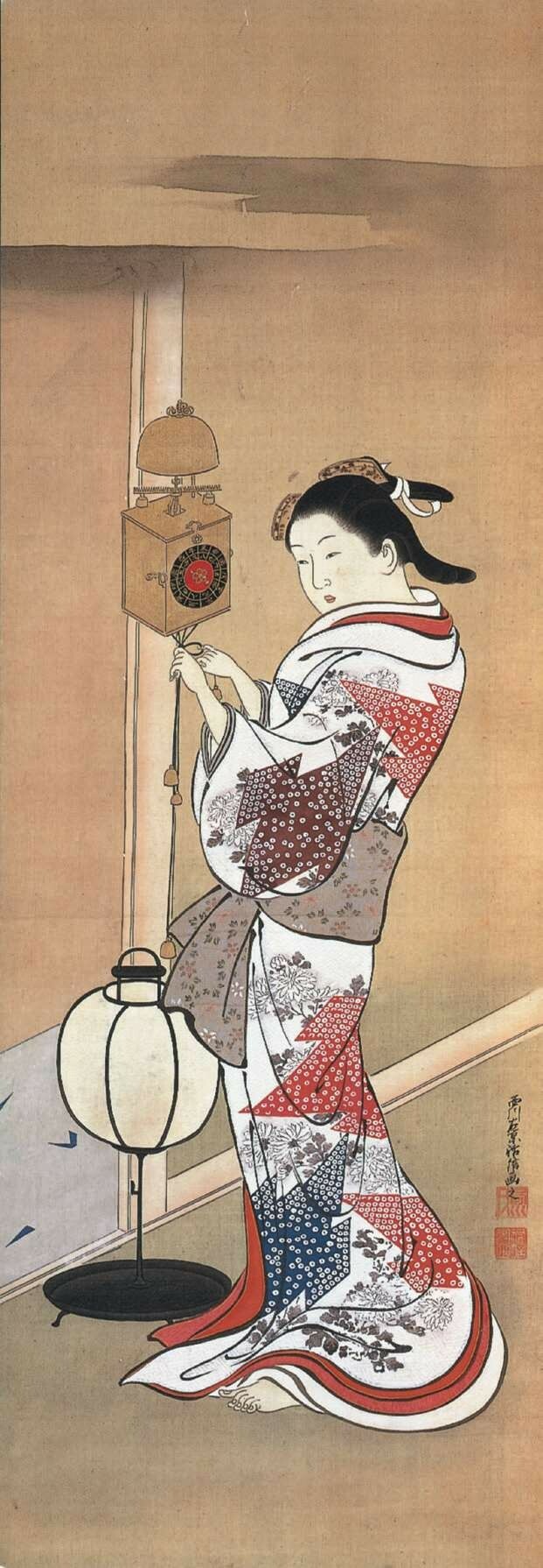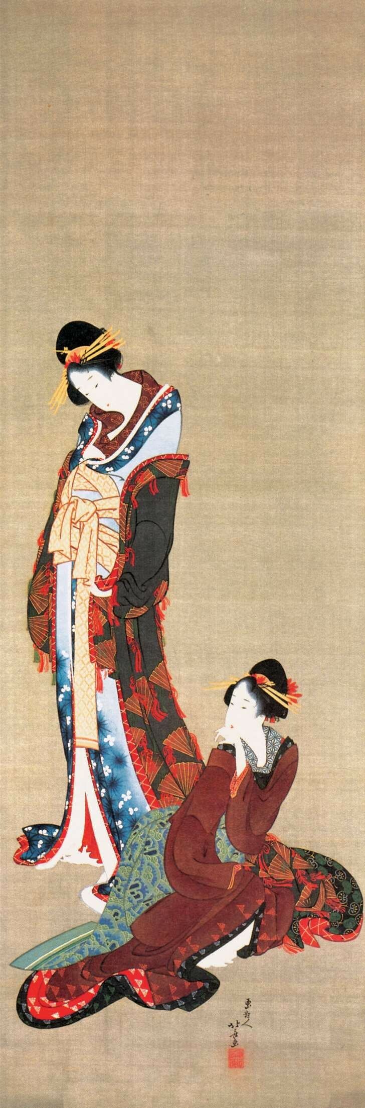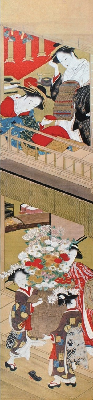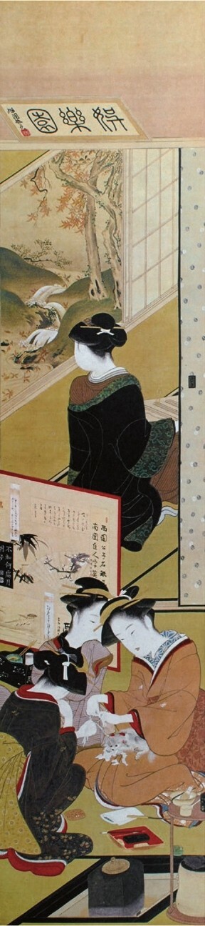 另一位擅长手绘美人画的画师是胜川派始祖胜川春章(1726—1792),他本姓藤原,名正辉,字千寻,是宫川派画师宫川长春的入门弟子,因此取画号春章,后改画姓为胜川。胜川春章是少有的在版画歌舞伎画和手绘美人画两个领域都取得很高成就的画师,他在1775年(安永四年)刊行的绘本《当世女风俗通》的跋文中就有“春章一幅值千金”(出自“春宵一刻值千金”)一语。他还与诸侯大名等权贵人物有来往,晚年在大和山藩主柳泽信鸿的资助下,专注于手绘美人画的制作。胜川春章的经典之作当属生动表现四季风情的《妇女风俗十二月图》系列(现存十幅),以各具特色的季节风物为题材,细腻刻画各阶层妇女的形象和活动,如其中的《十月 炉开》一幅描绘了旧历十月初亥日,一群正值花季的民家少女围坐茶炉玩抽签游戏的情景,膝上的宠物和窗外的红叶传达着天真美好的气息。《妇女风俗十二月图》与另一系列《雪月花》(三幅)一道被日本文部省列为国家“重要文化财”,这是至今为止对手绘浮世绘的最高评价。胜川春章的弟子胜川春好(1743—1812)、胜川春英(1762—1819)主要活跃于歌舞伎画领域。