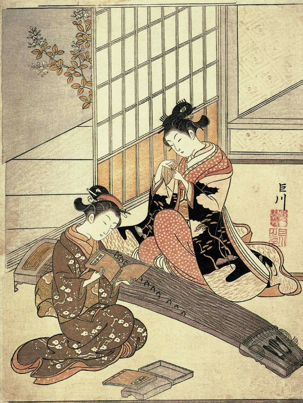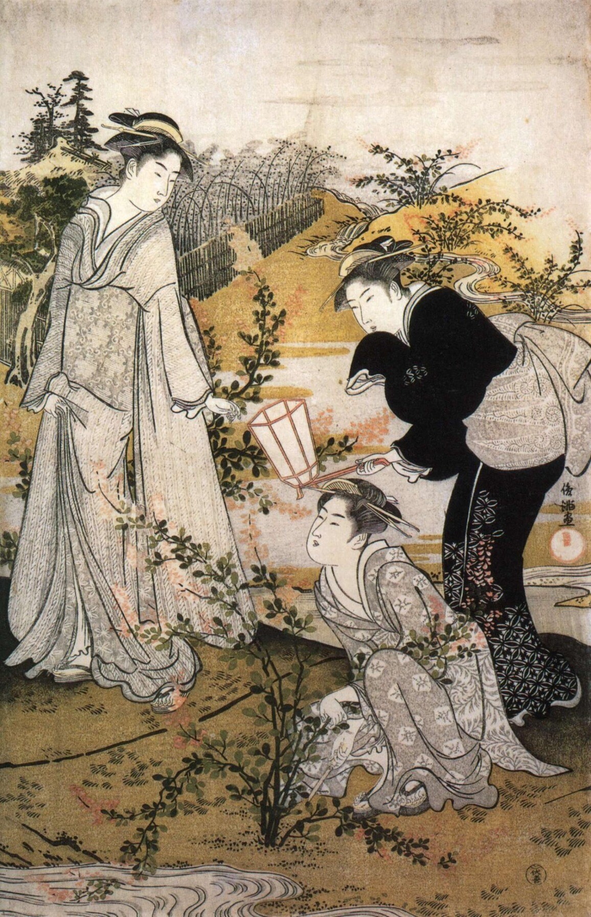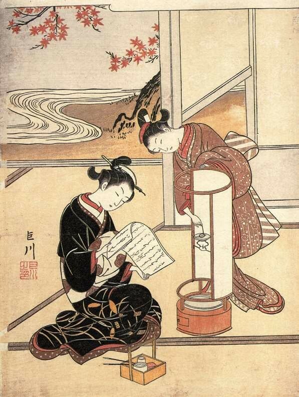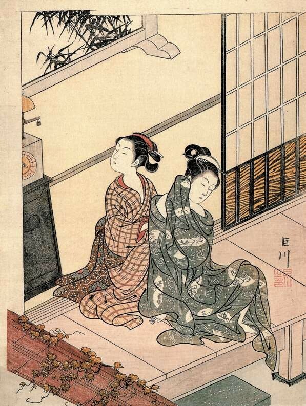另一位擅长手绘美人画的画师是胜川派始祖胜川春章(1726—1792),他本姓藤原,名正辉,字千寻,是宫川派画师宫川长春的入门弟子,因此取画号春章,后改画姓为胜川。胜川春章是少有的在版画歌舞伎画和手绘美人画两个领域都取得很高成就的画师,他在1775年(安永四年)刊行的绘本《当世女风俗通》的跋文中就有“春章一幅值千金”(出自“春宵一刻值千金”)一语。他还与诸侯大名等权贵人物有来往,晚年在大和山藩主柳泽信鸿的资助下,专注于手绘美人画的制作。胜川春章的经典之作当属生动表现四季风情的《妇女风俗十二月图》系列(现存十幅),以各具特色的季节风物为题材,细腻刻画各阶层妇女的形象和活动,如其中的《十月 炉开》一幅描绘了旧历十月初亥日,一群正值花季的民家少女围坐茶炉玩抽签游戏的情景,膝上的宠物和窗外的红叶传达着天真美好的气息。《妇女风俗十二月图》与另一系列《雪月花》(三幅)一道被日本文部省列为国家“重要文化财”,这是至今为止对手绘浮世绘的最高评价。胜川春章的弟子胜川春好(1743—1812)、胜川春英(1762—1819)主要活跃于歌舞伎画领域。