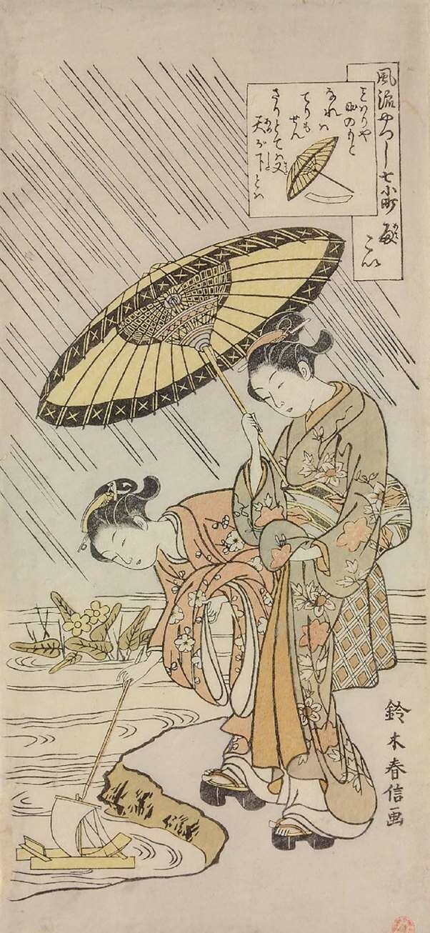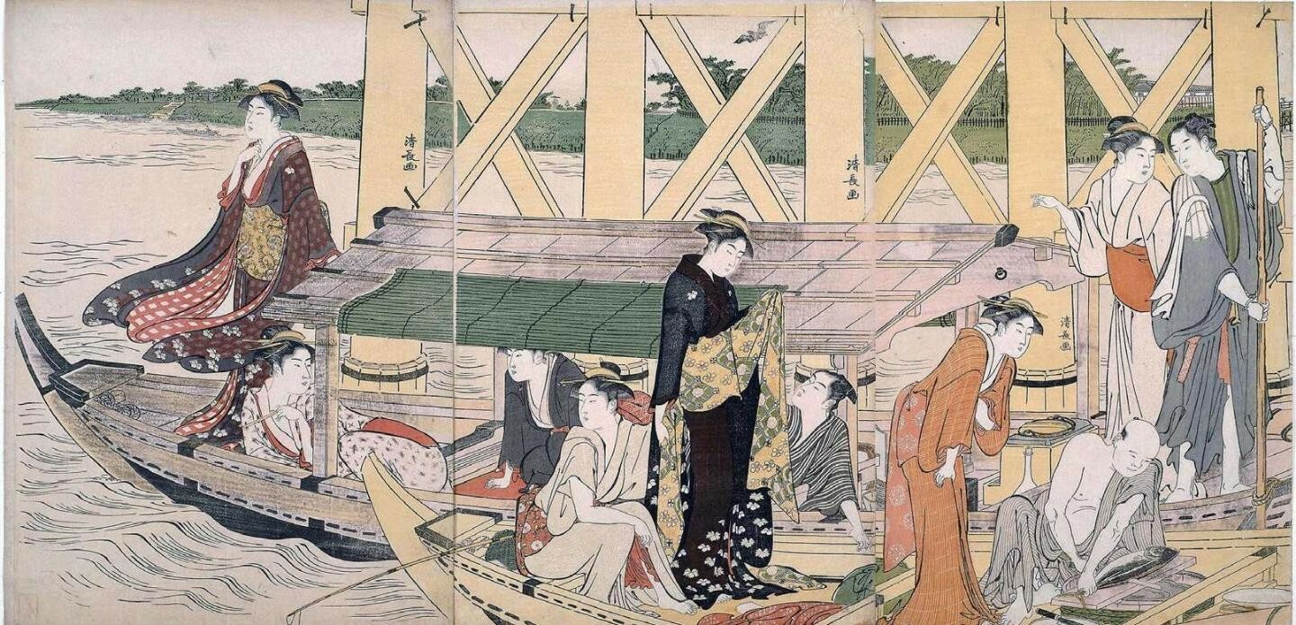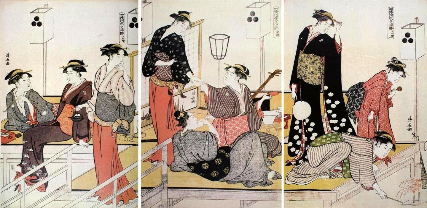 《四条河原夕凉体》是鸟居清长最初的三联画,四条河原是京都的地名,每年六月七日至十八日在附近的鸭川河畔举行的纳凉晚会是京都夏天的传统活动,“夕凉体”即夏夜纳凉。1690年(元禄三年)六月,到京都旅行的俳圣松尾芭蕉写道:“四条的‘河原纳凉’,从傍晚开始到月夜乃至黎明时分,在河中排列着坐铺,人们整夜饮酒吃喝玩乐。女子腰带上的花结很显眼,男子穿着长和服,从法师、老人到木桶匠和锻造铺的弟子,嬉笑怒骂与吟咏和歌交织,不愧是都城之风景。”他还为此作有俳句“河面风吹来,柿色麻衣薄如筛,晚凉月华开(川風や薄柿着たる夕涼み)”。《四条河原夕凉体》无论是画面构图还是人物造型都有很强的表现力,将各种姿态的女性巧妙地相互关联,呈现完美的画面,流畅的线条捕捉出富于变化的姿态的动感。画面右下角的少女正在俯身放流点着焰火的浮漂,据史料记载,京都的焰火大约出现于1558年,最初是作为神社祭祀活动中的手持焰火出现,后来逐渐发展为夏夜纳凉的焰火晚会。