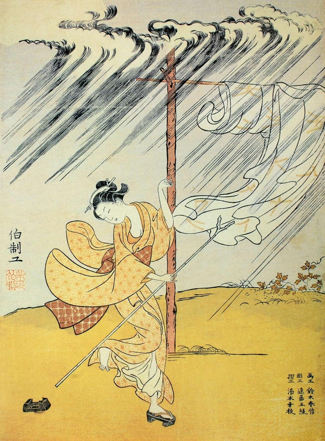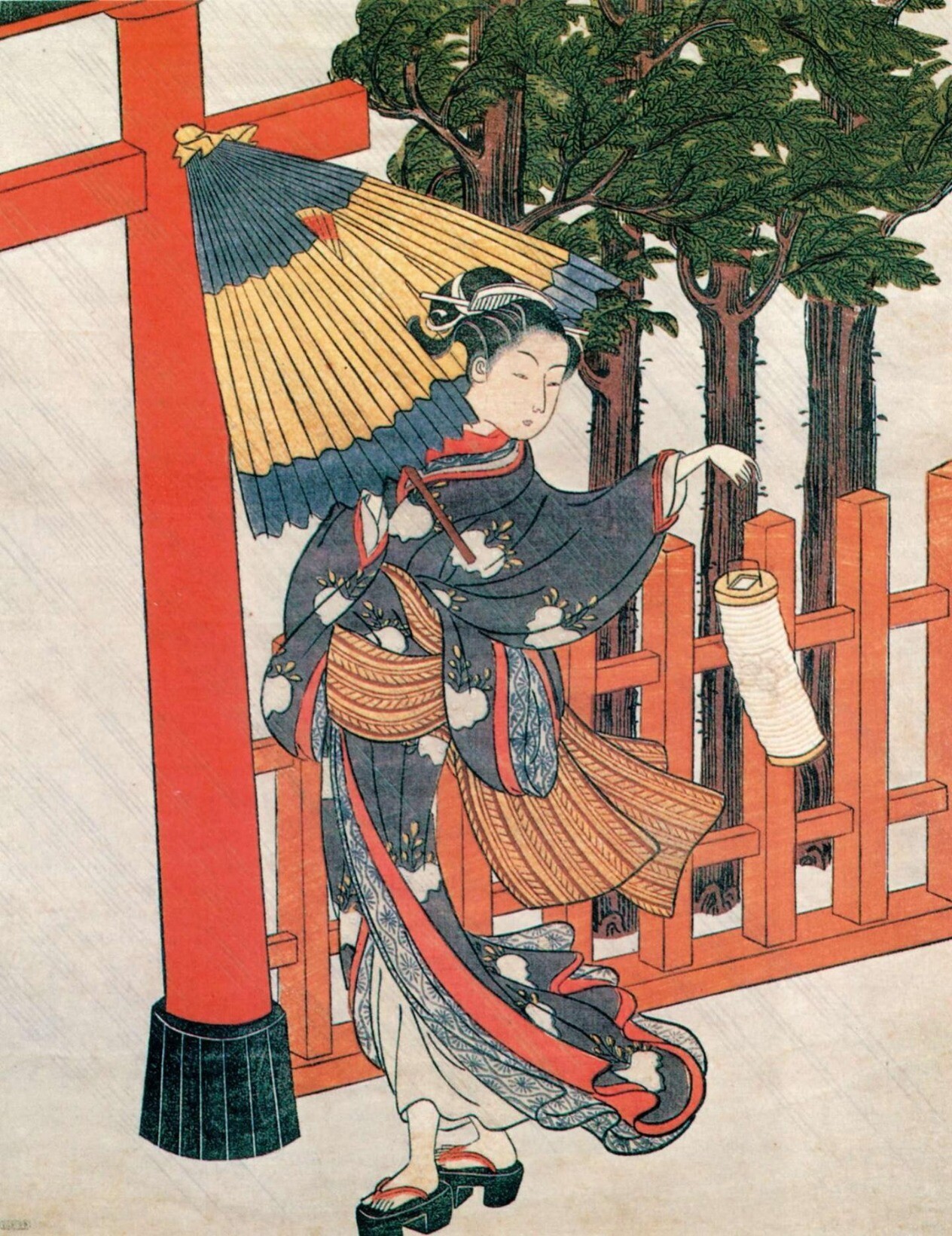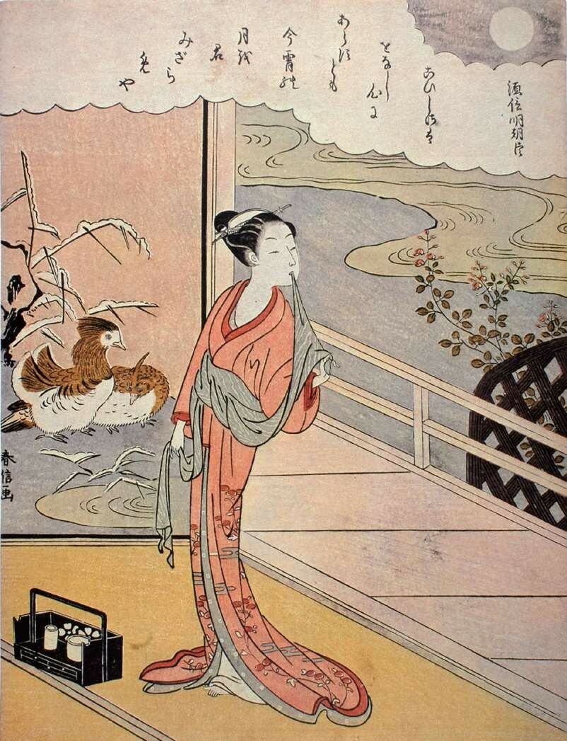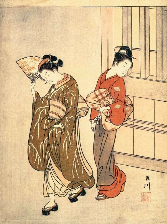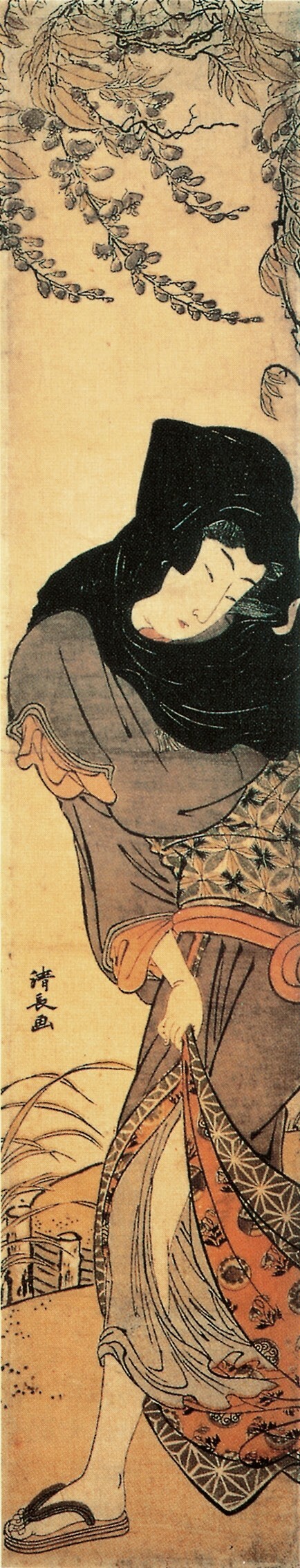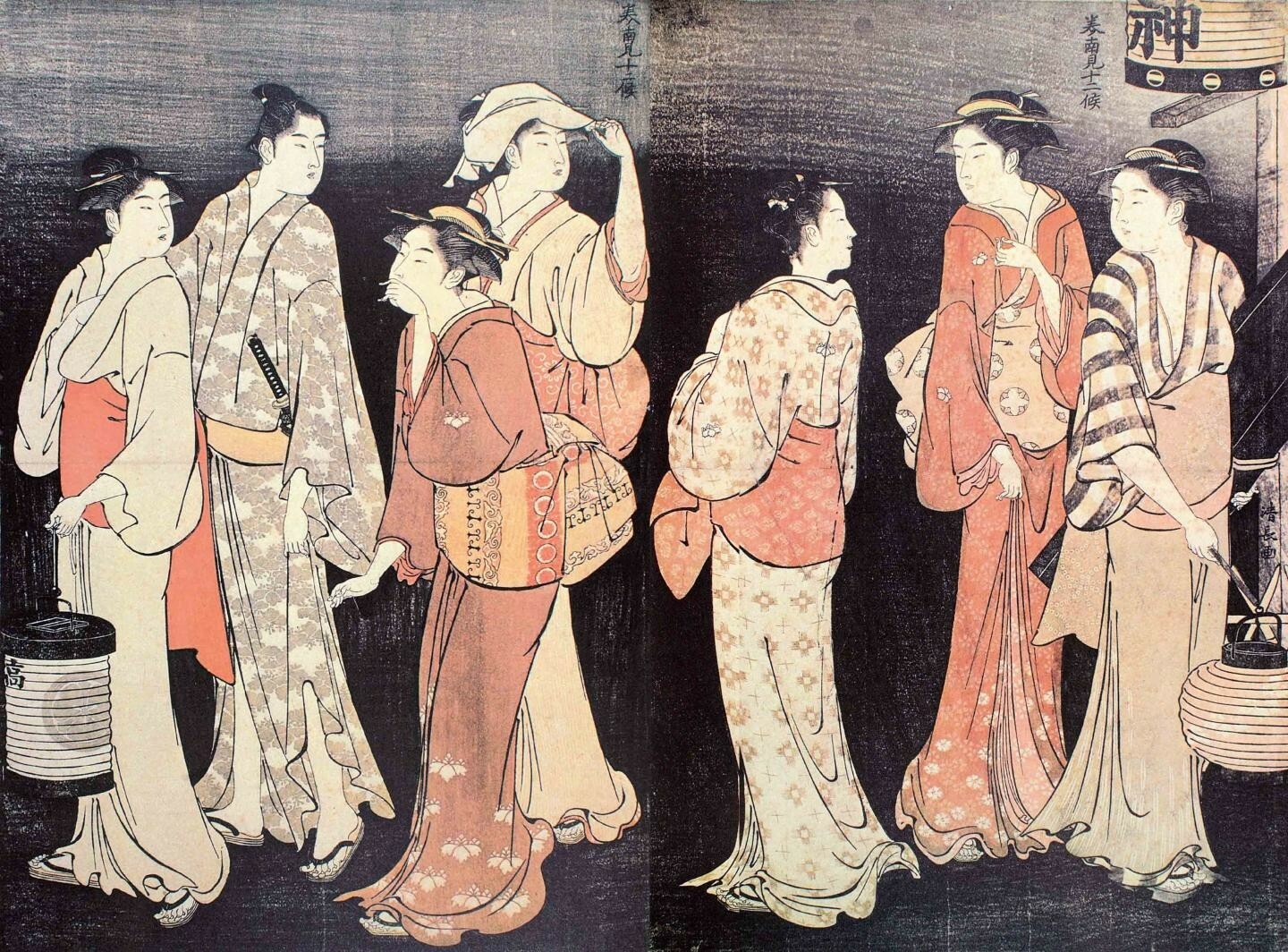 鸟居清长画业盛期的《美南见十二候》是他唯一的二联画系列,“美南见”指的是江户南部的品川一带,由于这里是通往关西的交通要道东海道线的起点,地利之便加上比吉原价廉的优势,形成了游乐集中街区;“十二候”即十二个月的景致,宽阔的视野很好地表现了当时盛况空前的游里四季风俗。其中的《七月 夜送》一幅不仅是该系列的名品,也被视为鸟居清长最经典的代表作,从画面右上方写着“神”字的纸灯笼可以看出这是神社的祭礼活动。画面上的7个人物动作自然,服装朴素淡雅,与环境融为一体。左幅描绘了送别年轻游客的两个青楼女子与手中执提灯的侍女。画面的整个背景涂上墨色,表现夜晚的景象,微光中可见右边与左边擦肩而过的组合相互回头用视线顾盼。苗条高挑的美人充满整个画面,是鸟居清长理想的女性美的表现。