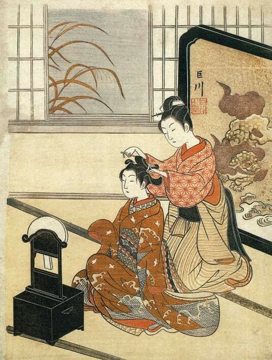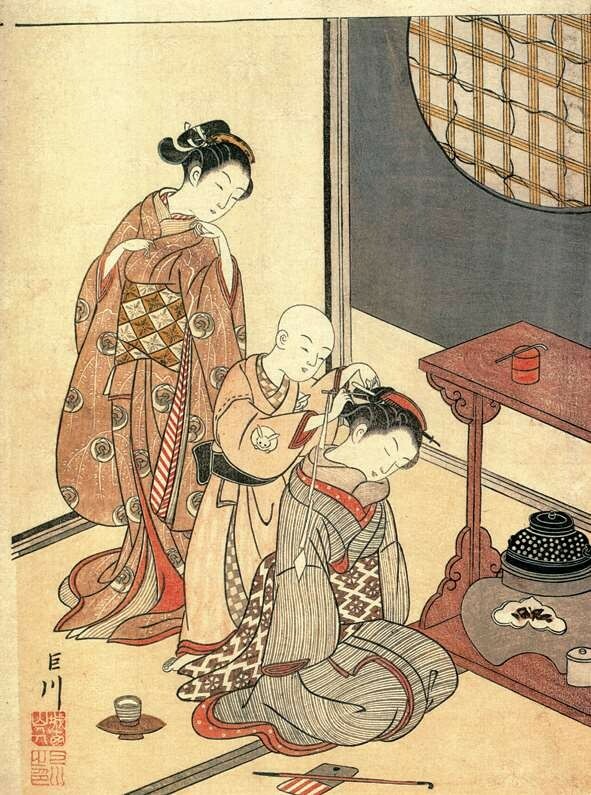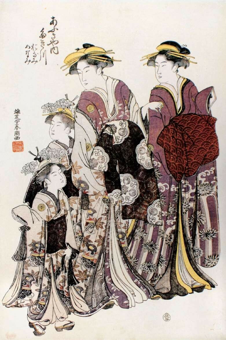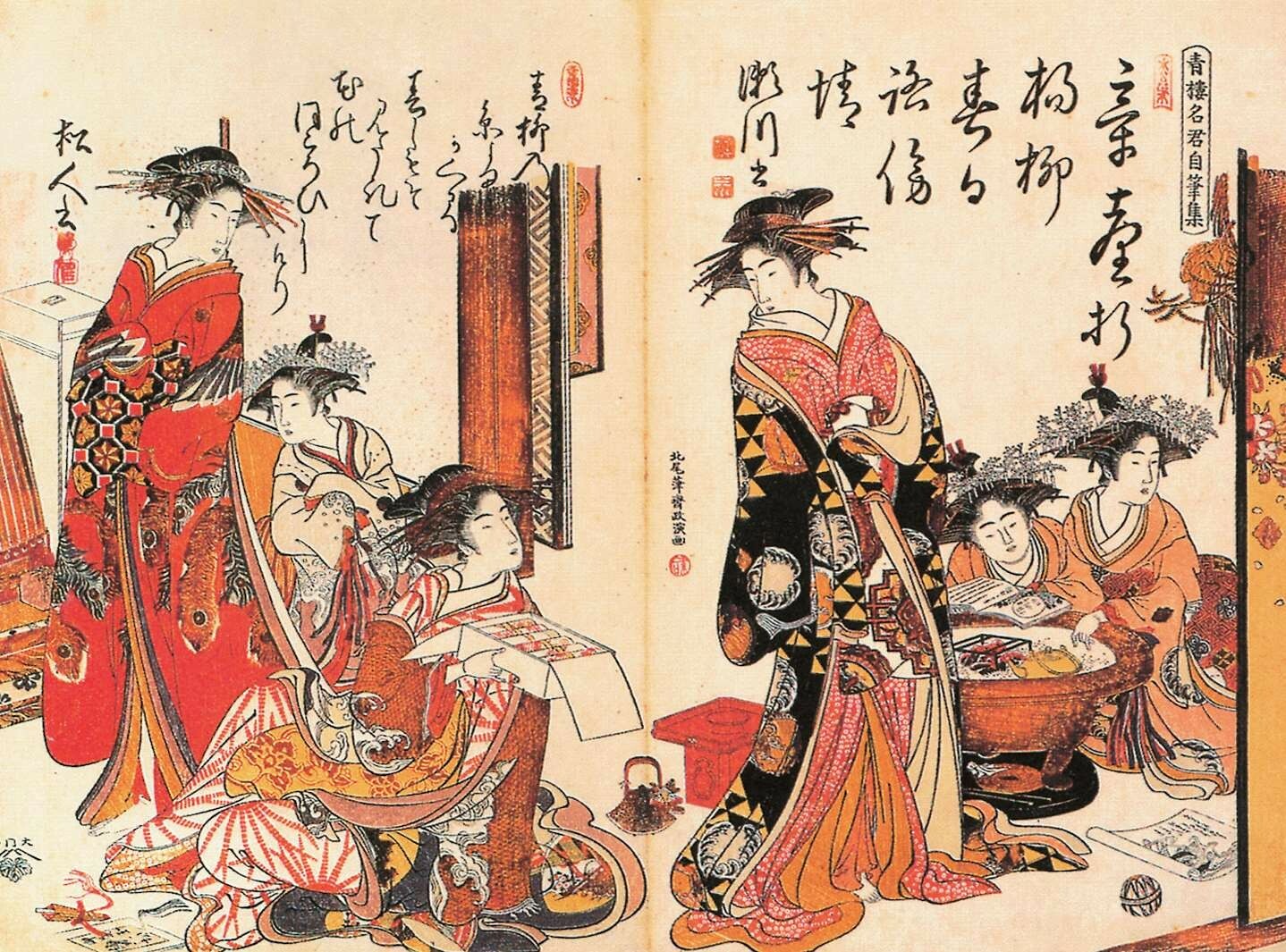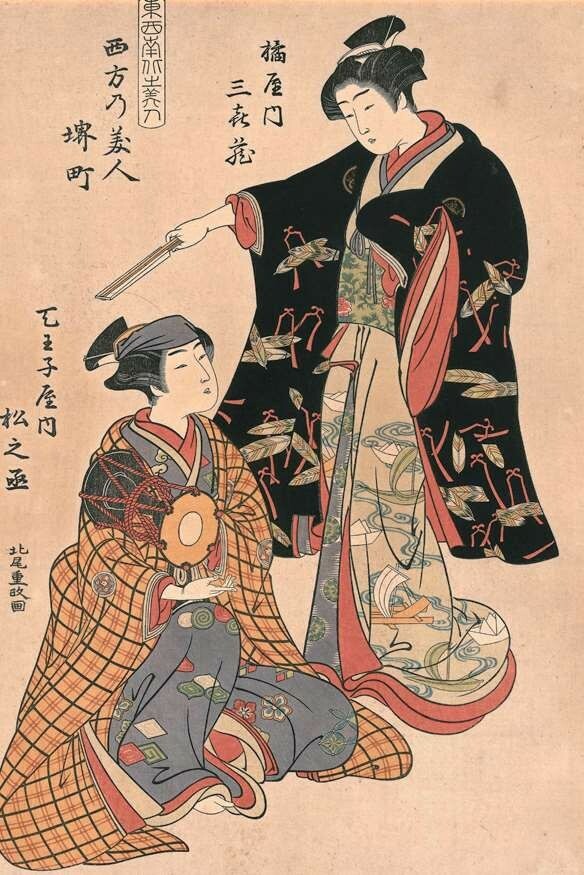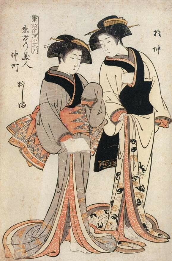 1679年(延宝七年)起介绍吉原的书籍《吉原细见》开始不定期出版,相当于今天的导游手册,是江户时代的畅销书,持续出版了150年之久。据1791年(宽政三年)出版的《吉原细见》记载,当时的游女接近三千人之多,俨然形成一个相对封闭的等级社会。其中最高级别的游女被称为“花魁”,也称太夫,不仅容貌姣好,还具备较高的文化修养,可谓才色兼备的明星,主要服务对象是贵族和高级武士。太夫与其次级别的格子、局女郎统称为“上位三等”,她们擅长乐曲、茶道、花道、诗歌、书法及舞蹈等传统技艺,是浮世绘美人画的主要原型,最早在1658年(万治元年)作为刻本插图出现。