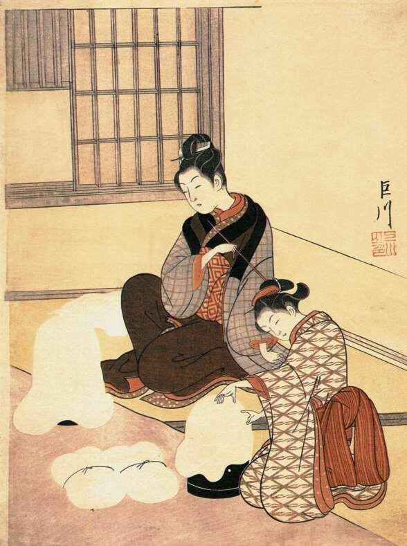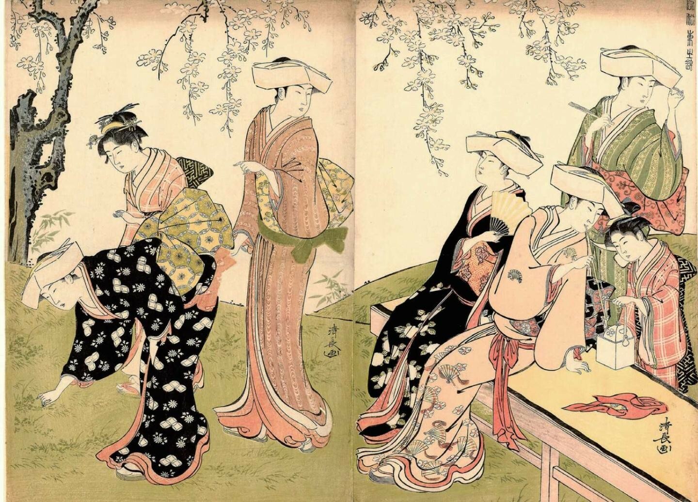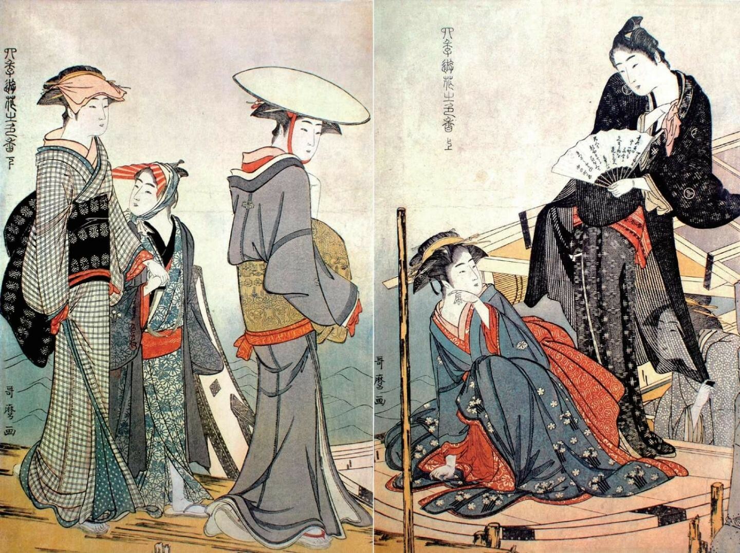 鸟居清长自1782—1784年间刊行的描绘游女的系列《当世游里美人合》和描绘江户南部品川地区风俗的系列《美南见十二候》,以开阔的视野表现了当时盛况空前的游里四季风俗;此外,《风俗东之锦》系列以写实手法生动描绘市井日常生活场景。这三大系列被日本学界统称为“三大拓物”,是充分体现鸟居清长个人风格的代表作。