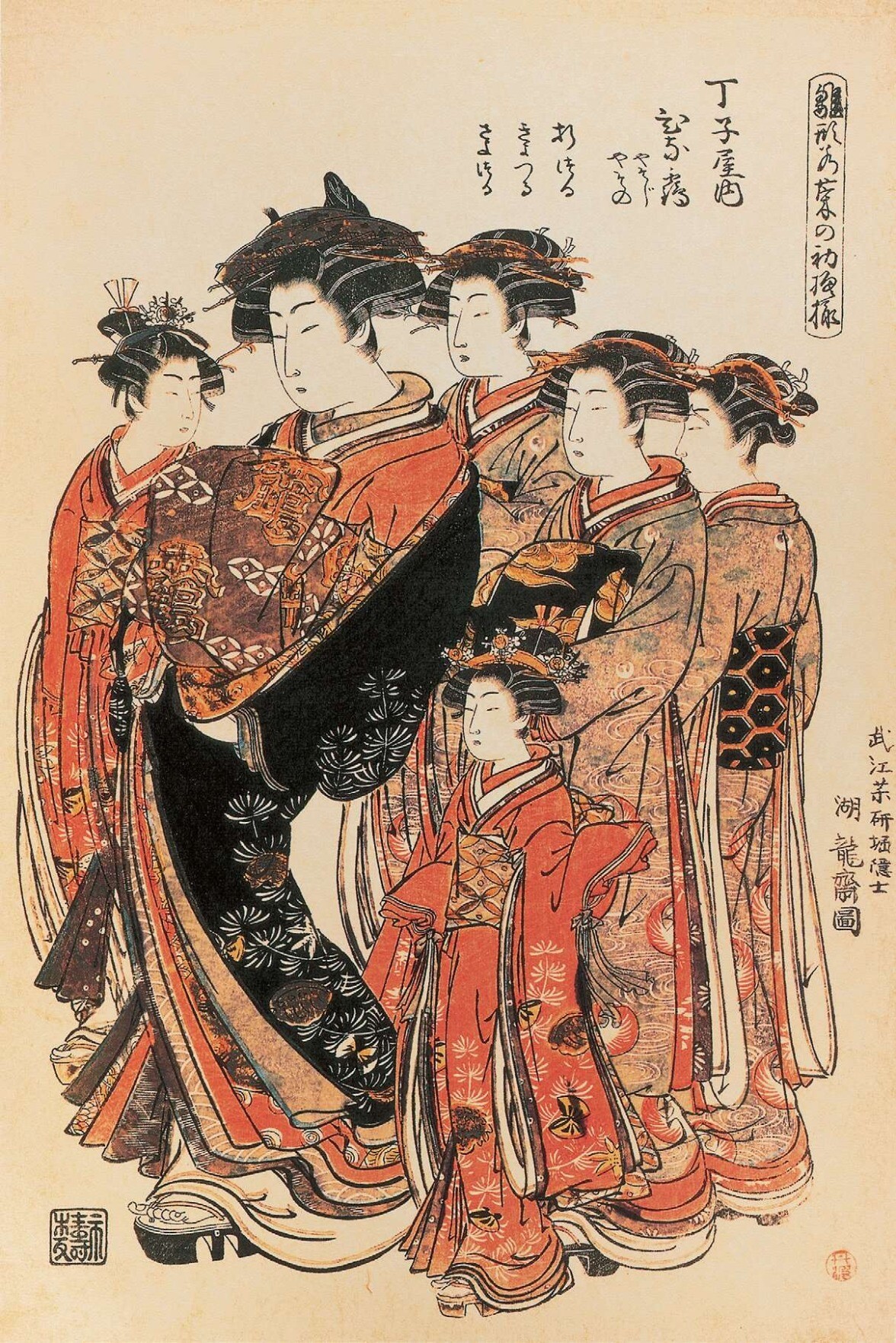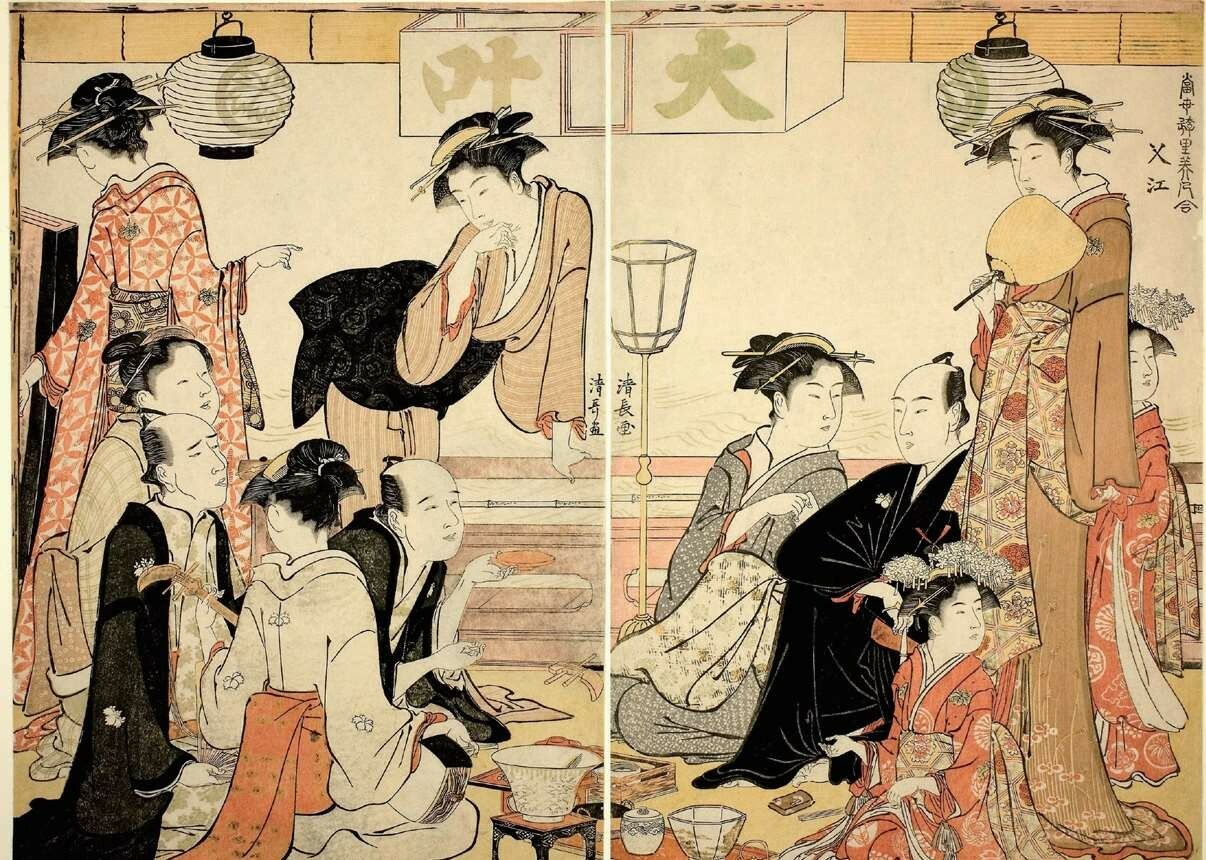 18世纪前期,吉原总人口超过八千人,其中游女人数在1743年(宽保三年)前后达到两三千人。维持这样一个庞大人群的生活来源,不再是拥有特权的富裕阶层,而是大批下级武士和市民职员。元禄年间(1688—1703)之后,随着武家政权逐渐衰弱,江户开始成为以市民为主导的城市,富裕起来的市民尤其是幕府的御用商人成为吉原的常客。宝历年间(1751—1763)高级游女太夫、格子不复存在,曾经作为见面场所、收取高额费用的“扬屋”也随之消失。同时增加了许多被称为“散茶”“埋茶”的低级游女,她们多属被取缔的私娼。由此,吉原的游乐方式也随之简化,加速了性作为商品交易的大众化。随着吉原游廓的门槛渐低,不仅吸引江户市民,来自全国各地的游客也被吸引至此,吉原迎来了繁荣的高峰。