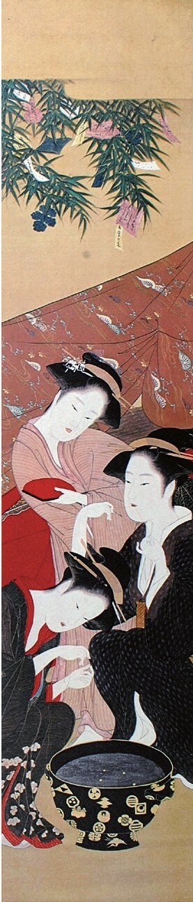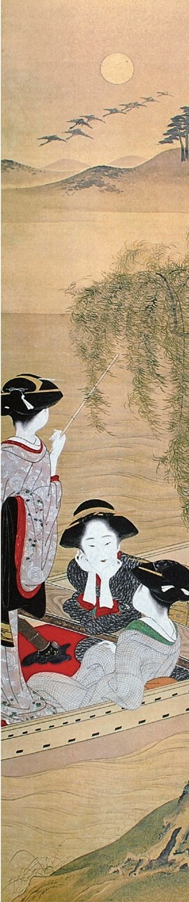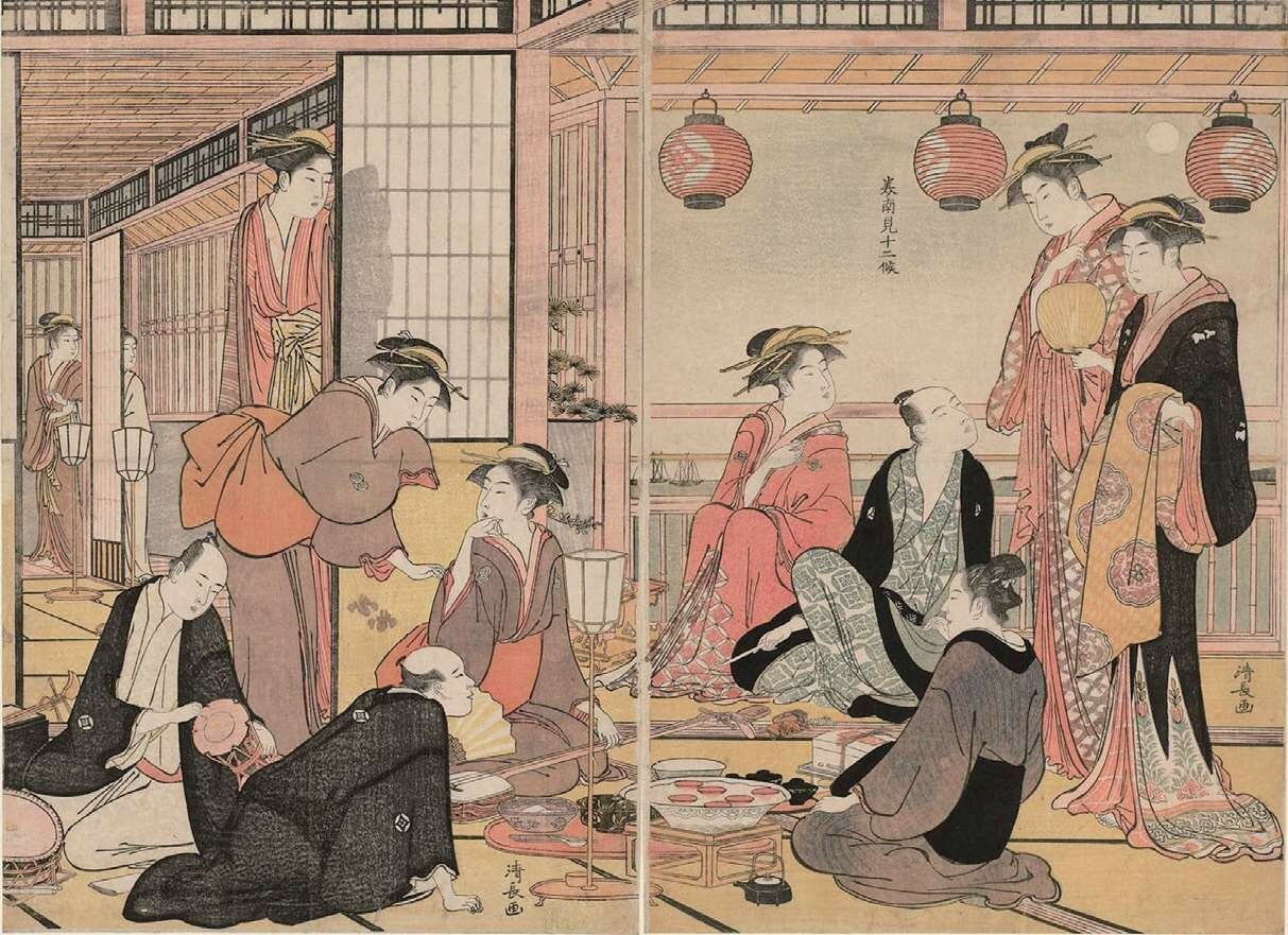 《当世游里美人合》系列主要表现吉原以外的其他色情街区的场景,也就是以非公认的私娼为主角的美人画。虽然幕府政权在建立吉原之后严令取缔私娼,但始终禁而不绝,18世纪后期是私娼的最盛期,江户地区约有70余处色情街区,几乎盖过了吉原的风头。《当世游里美人合》描绘了新吉原、橘町、叉江、土手花、品川、多津美等游里的女性风俗,现存21幅。其中《叉江》表现的是纳凉之夜食客、艺妓等欢聚餐饮的场景。“叉江”意即中洲,是夹在河与河之间的岛屿状土地,是江户隅田川下游的一片新开地,当时集中了各种饮食店和茶屋,是平民休闲娱乐的聚集区。画面描绘了客人、妓女、侍女等11人,表现了大厅酒宴的热闹景象。