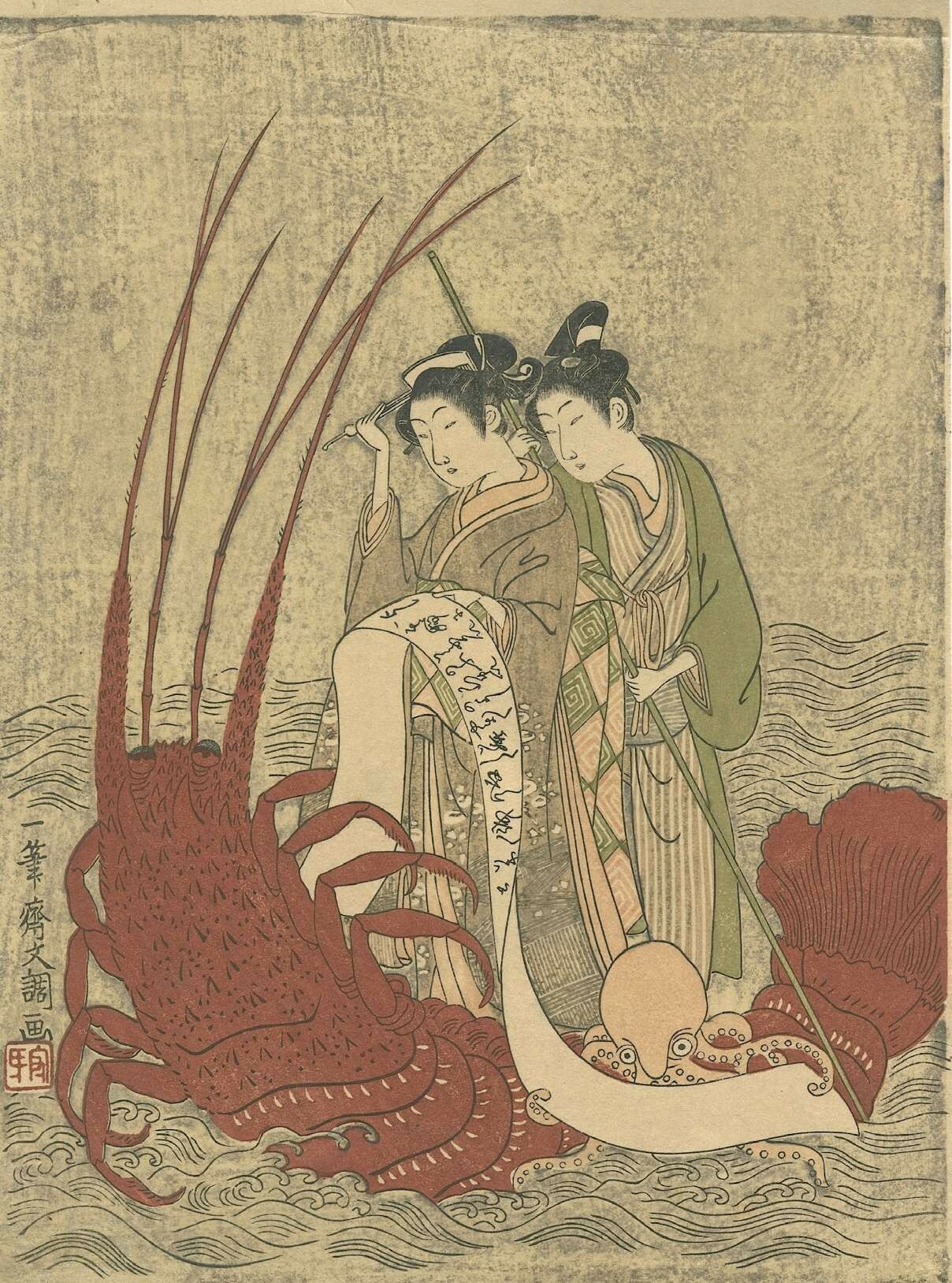 一笔斋文调的《伊势海老的恋舟》画面取伊势龙虾的吉祥之意,少女和她身后的“若众”还有一只拟人化的章鱼,一起捧读手卷上的和歌。日语“海老”即龙虾,伊势龙虾出产于日本三重县志摩半岛,最早记述“伊势海老”的典籍是1566年的《言继卿记》,龙虾的长须也被视为长寿的象征。在讲究食鲜的日本,龙虾被奉为高级食材的珍品。身披金属感十足的暗红色铠甲,加上华丽醒目的触角,令人联想到勇猛果敢的武士,由此成为“威风凛凛”的吉祥物。江户和大阪等地的诸侯为了庆贺新春,将龙虾作为装饰物,这种风俗一直延续到今天。
