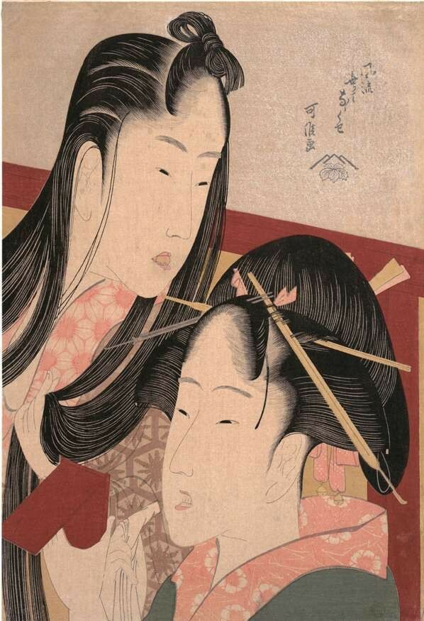 喜多川歌麿本姓北川,原名北川丰章。据日本学者的研究,其出生时间大约在1751—1764年(宝历元年至明和元年)之间。关于他的出生地,一说为江户,一说为京都,至今没有定论。他曾拜狩野派画师鸟山石燕(1712—1788)为师,1770年(明和七年)参与了由鸟山石燕及其门徒绘制插图的俳书《千代之春》的制作,这是至今为止发现的喜多川歌麿最早的画作。1781年(天明元年)他绘制《身貌大通神略缘起》的插图,始取画号歌麿,并将本姓由北川改为喜多川。该书脚本作者志水燕十系歌麿同一师门的师兄弟,喜多川歌麿通过他结识了对其后来的事业发展产生重大影响的出版商茑屋重三郎(1750—1797)。