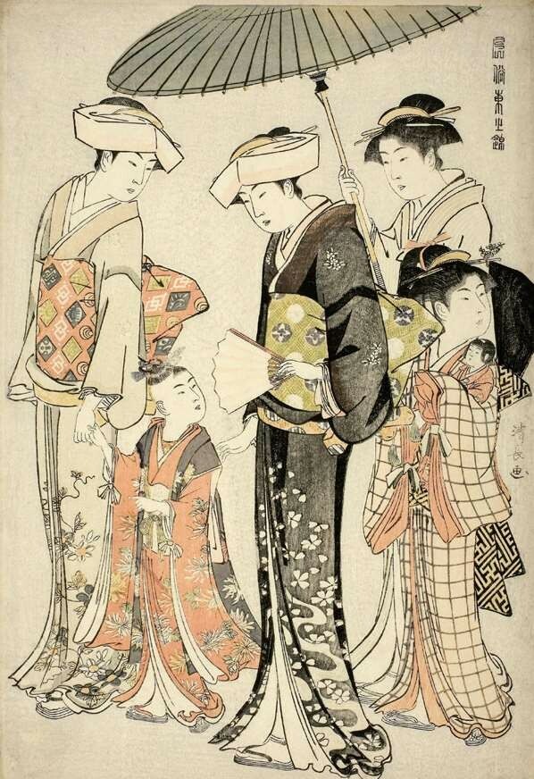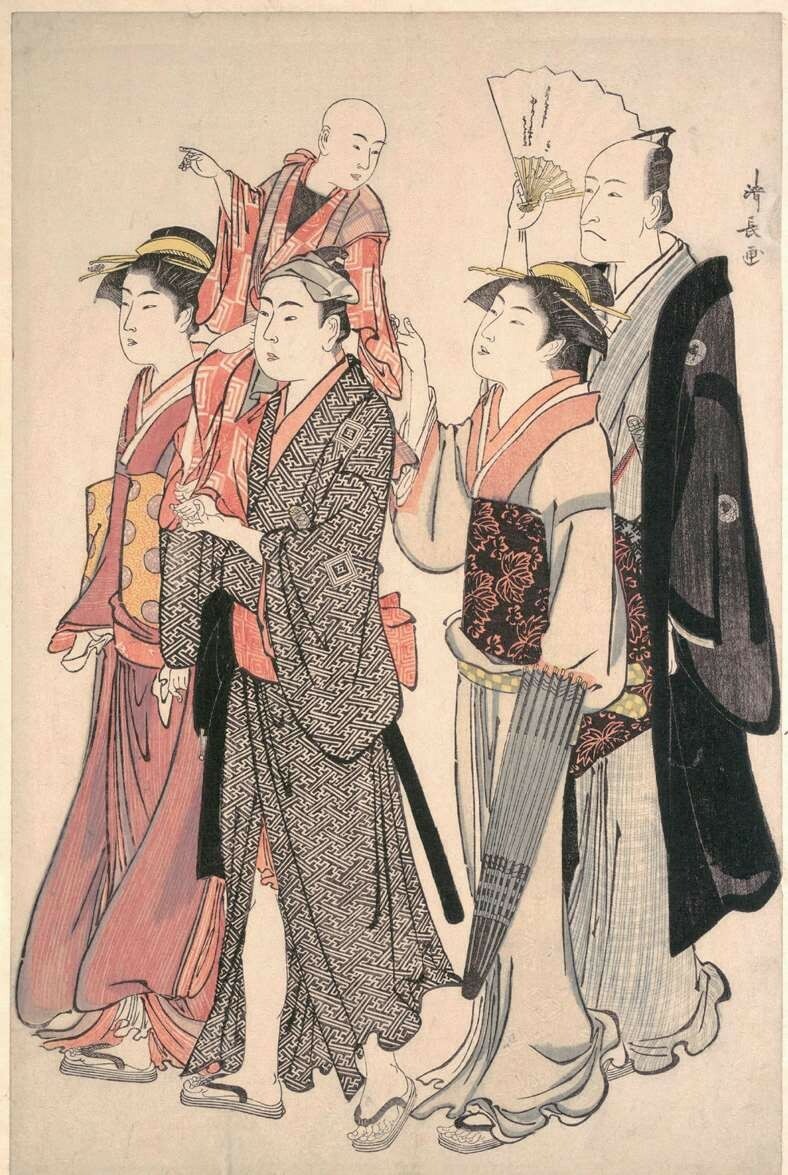 《风俗东之锦》系列共20幅,“东”即江户,题意为“繁花似锦的江户风俗”。大多是室外场景,其中《武家姬臣之外出》一幅表现的是武家生活。由于江户时代禁止文学、绘画作品直接表现高级武士将领的题材,因此这个画面表现的是武士将领的女儿外出的情景,四位侍女前呼后拥,一人牵手,一人打伞,一人摇扇,后面还有一位少女看上去是她的玩伴,小心翼翼地抱着玩具人偶。虽然背景一片空白,但通过人物动态和道具依然可以感受到是在炎炎夏日里的出行;《春之郊游》描绘了参拜神社的女子们在野外游玩的情景,画面右侧的一位女子坐在折凳上用烟管抽烟,左侧是精力充沛出来摘草以及随行的女子。左右两幅构图既各自独立,又通过中间两位人物相互对视的眼神形成关联。
