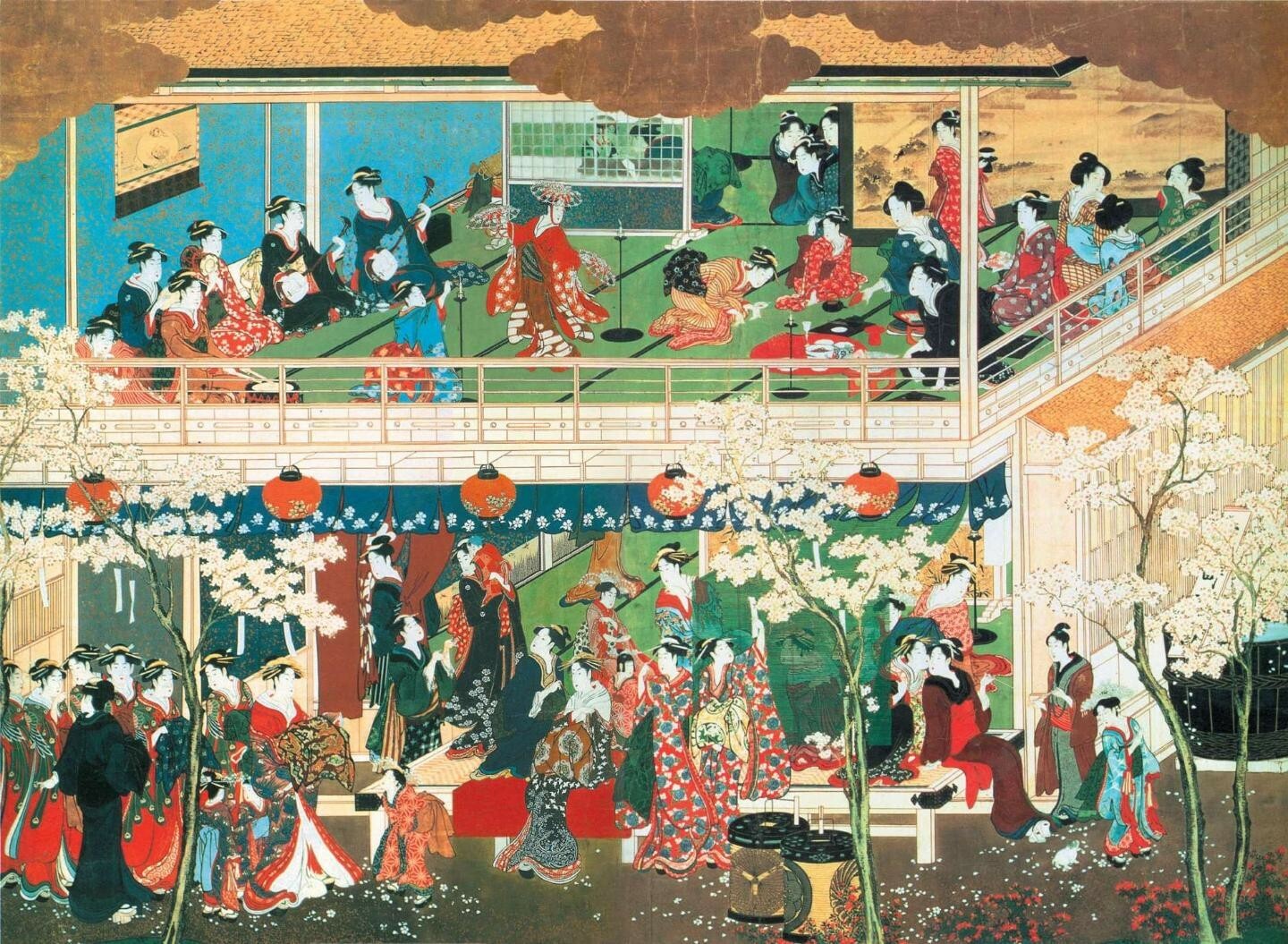 1791年(宽政三年)可谓喜多川歌麿画业的空白期,豪华狂歌插图本被禁止,茑屋重三郎遭处罚,只能靠再版一些旧作度日。然而,不仅上层权贵们不满节约禁奢的政策,统治阶级内部也出现了反对派,又值西方资本主义势力开始逼近日本,国内外矛盾使幕府当局日感危机来临。宽政五年(1793)七月松平定信被解除“老中”之职,“宽政改革”半途而废,隅田川畔女色酒气依旧。最具代表性的莫过于喜多川歌麿在当年完成的大幅手绘美人画《吉原之花》,这是他《雪月花》系列的其中一幅,另外两幅分别为《深川之雪》(约1802—1806)和《品川之月》(1788),均以艺伎、游女为题材。《吉原之花》表现的是吉原茶屋周围在樱花盛开的三月赏花的情景。左下方的街面上三位花魁正在侍女们的簇拥下款款而行;二层正在举行歌舞表演,鼓乐齐鸣,婀娜多姿。全画共出现约50位人物,光彩照人的服饰与樱花竞相媲美,极尽奢华。此外,由于宽政改革的冲击,画面上的吉原街头几乎没有男性出现。这是当年吉原的真实写照,也是浮世绘画史上唯一一幅全景式表现吉原的作品。
