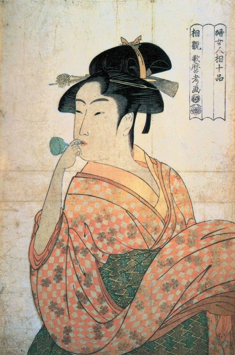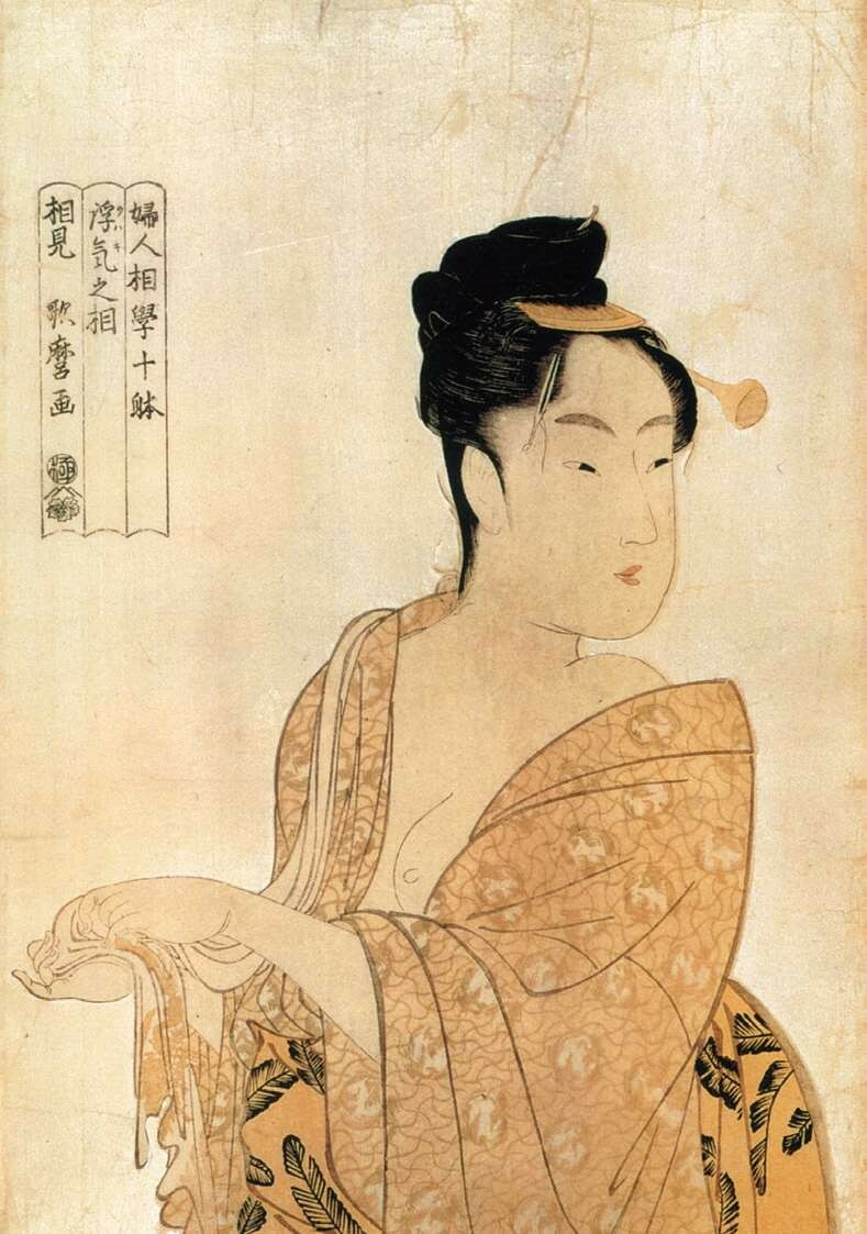 1792—1793年(宽政四至五年)左右,喜多川歌麿先后发表了《妇人相学十体》系列和《妇女人相十品》系列。它们实际上是同一个系列,后来不知出于什么原因换了题目,都是喜多川歌麿艺术高峰的初期杰作。“相学”即面相、手相等占卜术,喜多川歌麿意在借题表现不同女性的表情与性格。人物均为半身像,与此前的全身像形成鲜明对比。此外,首次在背景上使用的云母拓技法,在浮世绘技术上具有开创性意义。