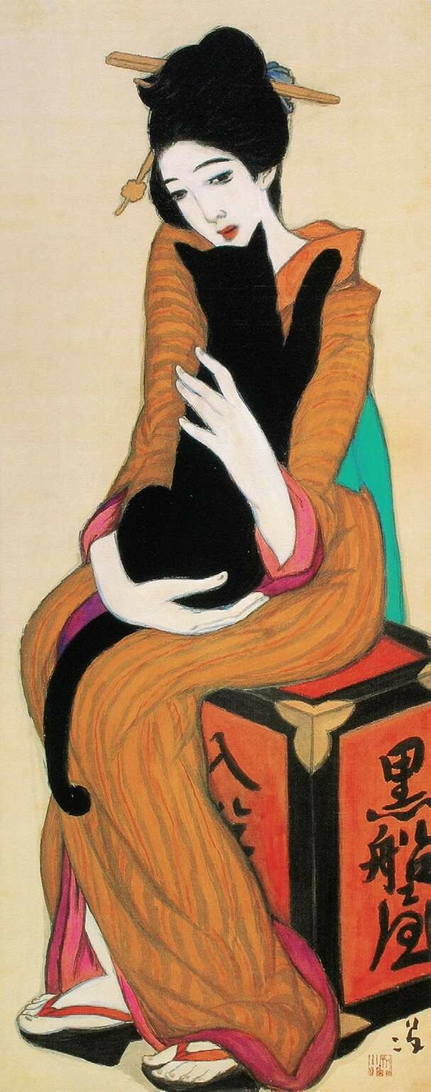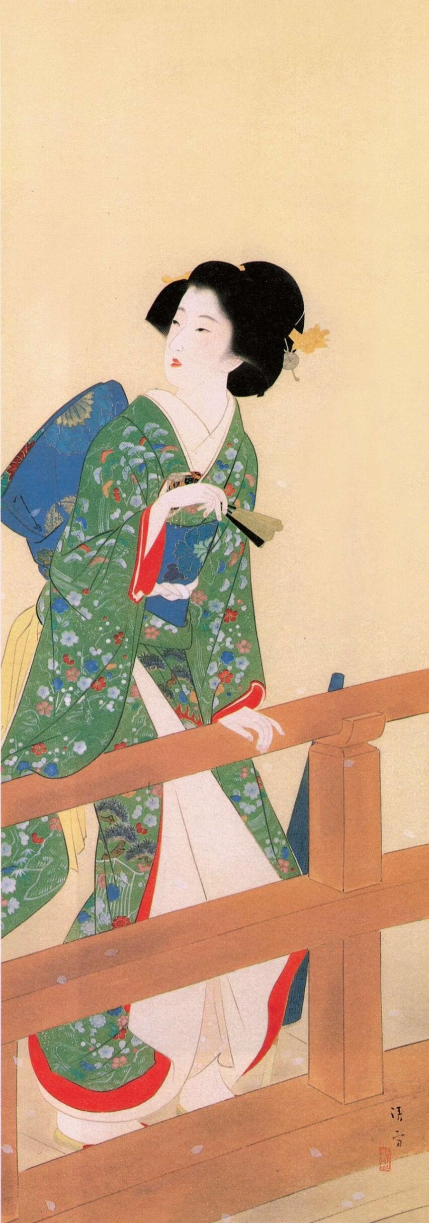 镝木清方(1878—1972)少年时代就开始学习浮世绘,并有深厚的文学修养。作品主要反映下层社会的百姓生活图景和他的怀旧心态。说唱曲艺、歌舞伎等民间艺人以及千姿百态的女性形象构成了他的作品世界。《花开时节》中一袭和服装束的少女在木拱桥上嫣然回首,服饰图案与纷落的樱花花瓣相呼应,温情地传递着春天的讯息,是浮世绘美人画向现代日本画的转化。