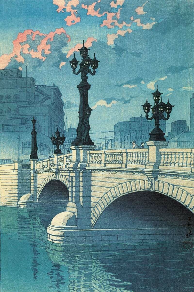 川濑巴水(1883—1957)曾拜镝木清方为师学习日本画,是“新版画”运动的主要画家。作品以风景画为主,不仅流连于江户时代的往昔遗迹,也将视线投向新时代的都市景观。与歌川广重的《江户名所百景》有异曲同工之妙,《日本桥(夜明)》细腻的明暗和冷暖微差的淡蓝色调,静谧的画面充满温馨的情趣,歌川广重的乡愁风景在他笔下被赋予清新的现代意韵。