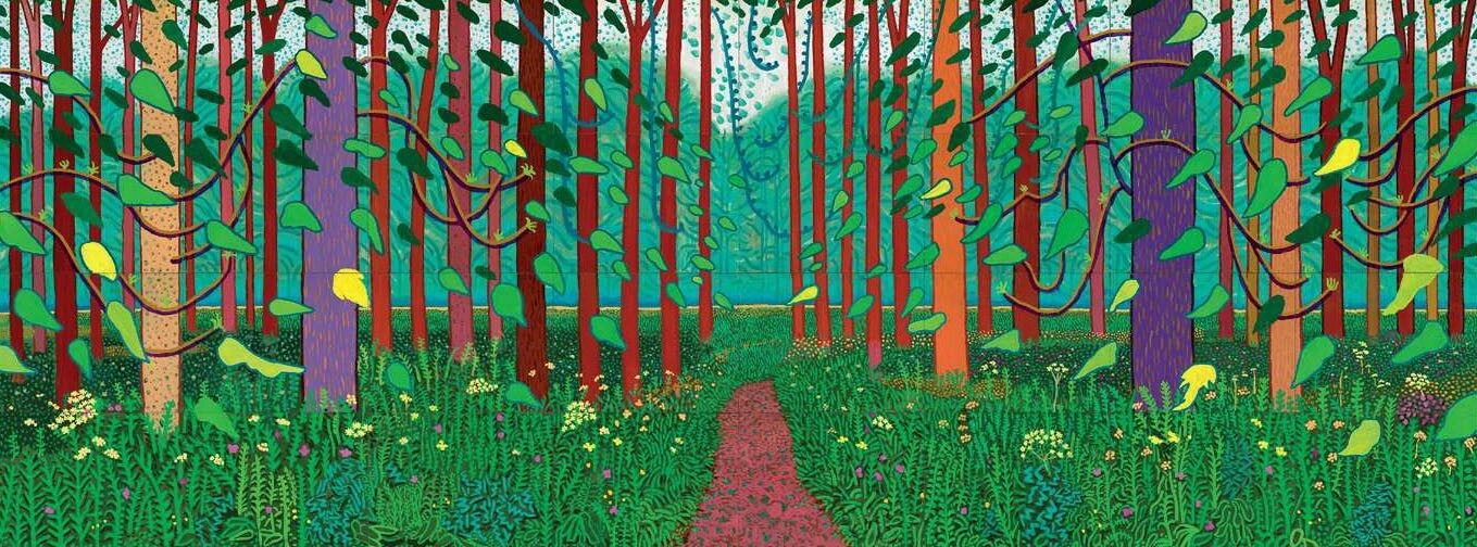 这是一件令人难以置信的艺术品。我这样说,是因为去过东约克郡的沃尔德盖特,感受过那从北海吹来的刺骨寒风的人,几乎不会立马认出霍克尼笔下色彩斑斓的林地就是那里。至少一开始不会。那里果真有紫罗兰色的树干和灿烂的阳光?拜托!说是潮湿的棕色树林和瓦灰色的天空还差不多。有人说,人会透过玫瑰色眼镜看世界,而霍克尼的“眼镜”永远是圣特罗佩模式,那里的一切都被迸发的明亮色彩所照亮,尽情沉醉于对生命的礼赞。