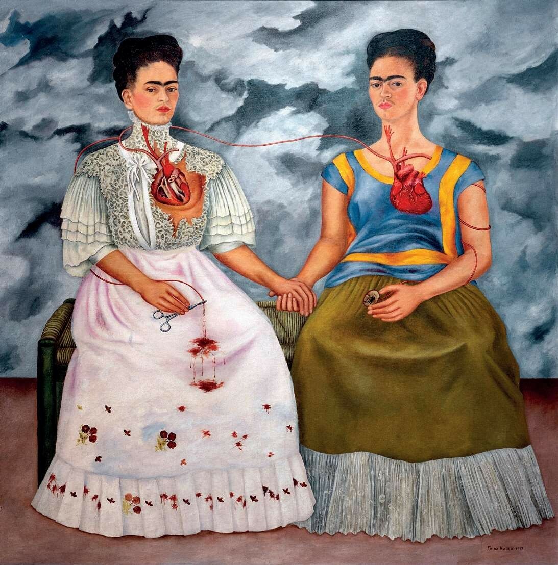背景奠定了画面的基调,乌云密布中透露着不祥。前景中,绿色的柳条长椅上坐着两个弗里达。她们手拉手,团结一致。她们的肩膀略微朝向对方,眼睛却直视观众——这不是一场内部对话,她们在和我们说话。其中一个弗里达穿着传统的墨西哥服装,另一个穿着殖民地时期风格的婚纱。这就是弗里达的两面:墨西哥的弗里达拥有来自母亲的印第安血统,欧洲的弗里达则有着来自父亲的德国血统。我们推测迭戈更喜欢墨西哥的弗里达,因为正是这个弗里达的左手中拿着他的小照片。小照片连接着一条充满血的血管,血管沿着她的手臂蜿蜒而上,流进她那暴露在体外的半截心脏。另一根血管从动脉中伸出来,一路流向欧洲的弗里达——另一半心脏正在她的胸前跳动。还有一根血管穿过另一条动脉,径直流向她的右手。她的右手拿着一把止血钳,夹住血管以防它流血不止。好吧,没有完全夹住。有一点血滴到了欧洲的弗里达的裙子上,融入裙边上的红花装饰中。