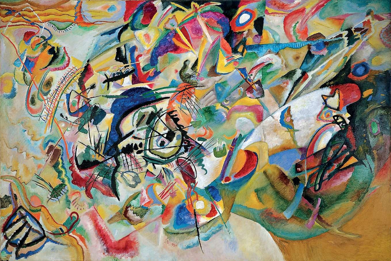 1913年,一幅名为《构成七号》(Composition Ⅶ)的画作,宣告了他艺术和音乐交叉的冒险达到了巅峰。这幅画有一面墙那么大(2米×3米),激烈、狂乱,其中有很多他在勋伯格的无调性作品中首次发现的不和谐因素。在三十年间,他以“构成”为题创作了十幅画(其中前三幅已在战争中遗失),这幅画就是其中之一。这些画均有相似的心理出发点,他用诗意的语言对此进行了描述: