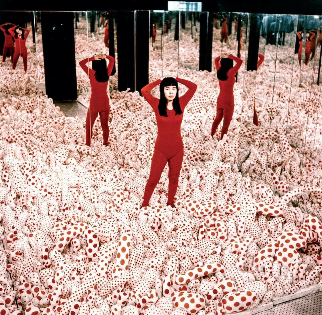 1965年,她展出的《无限镜屋:阳具原野》(Infinity Mirror Room — Phalli's Field),聚合了她所用的一切元素。这是一间包罗万象的镜屋,面积25平方米,里面摆满了织物制作的阴茎,上面布满红色圆点。这件作品将她对性的焦虑与令她不安的幻觉结合在一起。“恶业”就范,屈从于她的意志,变得中立,然后归她所有。她不仅仅是看到自己的创伤,还赋予它们以活力,在此过程中创造出触动数百万人的艺术作品。世界各地,无论老少,不惜排几个小时的队进入草间的无限镜屋,或是布满圆点的画廊,只为有机会从草间弥生的角度观察生活。