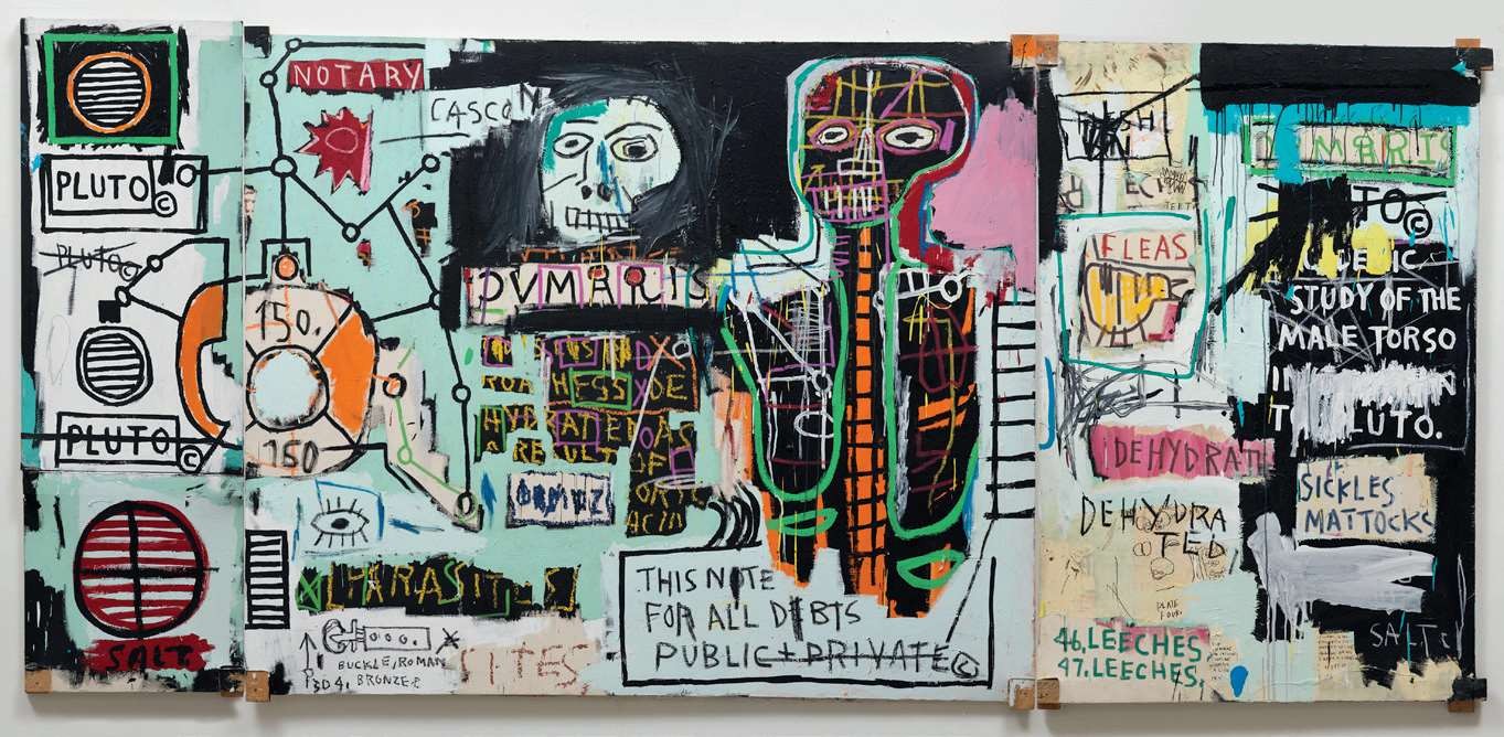 这幅画始于左上角的PLUTO(冥王星),巴斯奎特基于伽利略的第一幅月球草图绘制了冥王星。他在PLUTO这个词的右下方加上了符号©(这是他在“SAMO©”时期反复使用的符号),显然是为了防止迪士尼争夺这个名字的所有权。他把下方的PLUTO画掉,因为这个好词写得不好。画面左下角的SALT(盐)在右下角也重复出现,是指这种矿物在古罗马被用作贵重的货币。