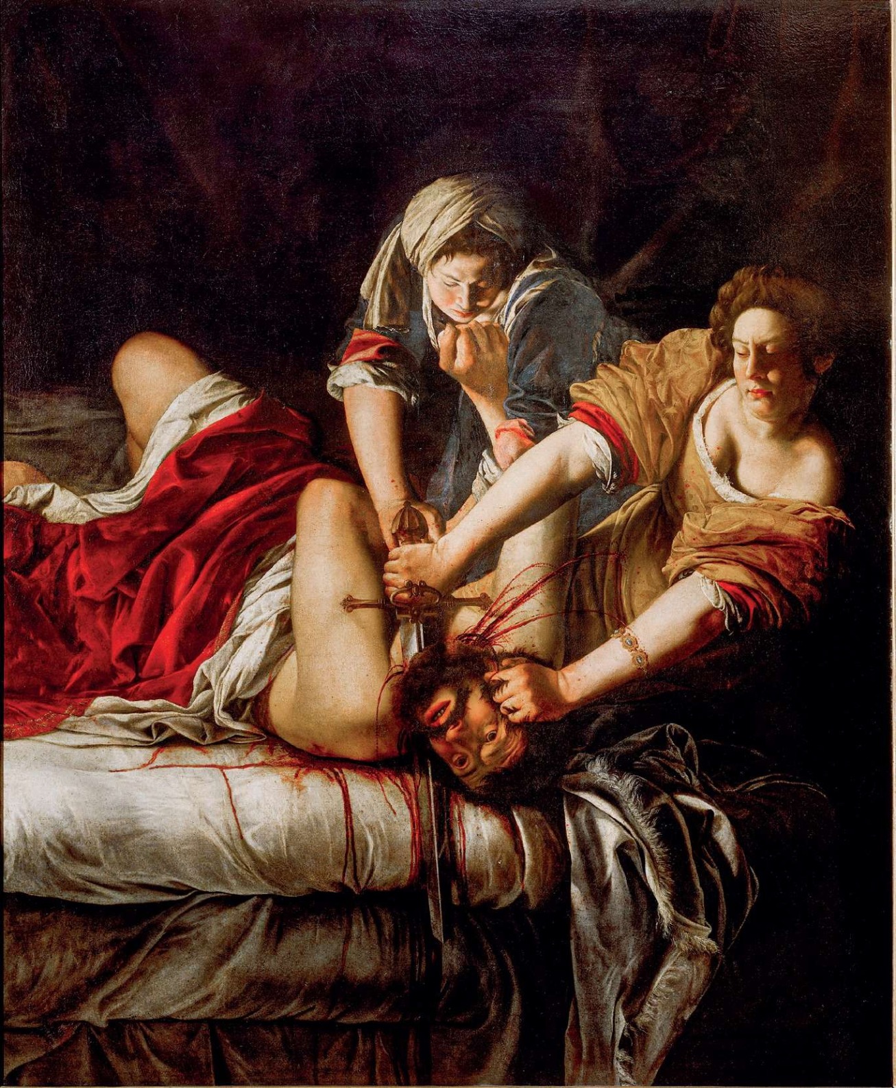 阿尔泰米西娅·真蒂莱斯基在充满敌意的环境中,成功地为艺术引入了一种全新的视角和人物形象。这是一名独立无畏、才华横溢的女人的视野,她从女性视角展现通俗的《旧约》故事,这些简直和煤矿里中暑一样罕见。强壮的男性被重新塑造成不怀好意的傻瓜;瘦弱的女子则弃之不用,取而代之的是有态度、有能力的女性形象。《朱迪斯斩杀霍洛芬尼》(Judith Beheading Holofernes,1612年)就是其中代表。好色的亚述军官霍洛芬尼将年轻的寡妇朱迪斯请进了自己的帐篷。他对她和她的家乡以色列毫无善意,计划对这位本地女子施以恶行,然后在第二天早上杀掉她,并占领她的祖国。但他误判了形势,低估了朱迪斯。在朱迪斯的劝诱下,他喝了大量的酒,随后昏迷不醒。这酿就了大错。他刚开始在床上打鼾,朱迪斯就拾起他的剑,从肩上割下他的头颅。