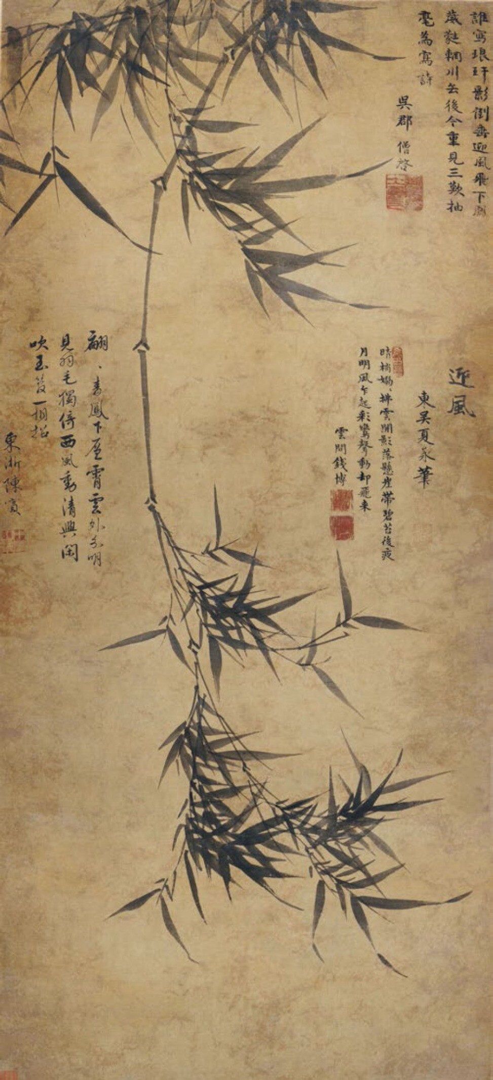 东坡先生守湖州日,游何、道两山,遇风雨,回憩贾耘老溪上澄晖亭,命官奴执烛,画风竹一枝于壁间。后好事者刻于石,寘郡庠。予游霅上,因摩挲断碑,不忍舍去。常忆此本,每临池,辄为笔游而成,仿佛万一。遂为作此枝以识岁月也。梅道人时年七十一,至正十年庚寅岁夏五月十三日竹醉日书也。