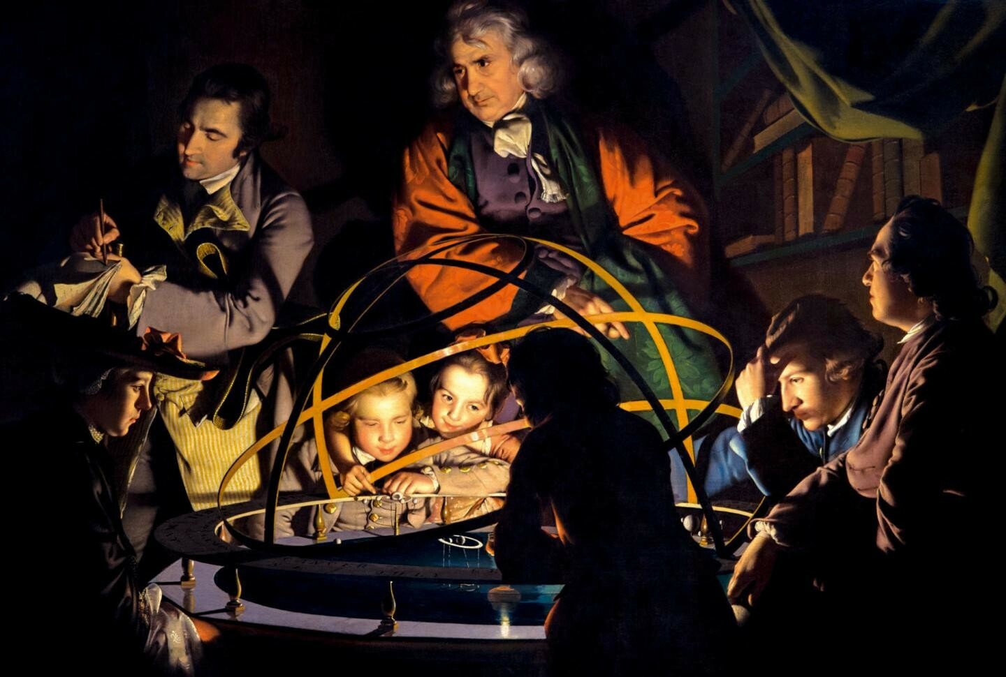 历史学家保罗·杜罗(Paul Duro)认为,赖特的作品以二元对立为特征:光明与黑暗、理性与想象、理论与实验。我们可以在赖特最著名的画作《太阳系仪》中看到这些对立面在发挥作用。这是一个极具氛围感的场景,一场面向少量听众的科学讲座正在进行。一位身着红色长袍的讲演者站在太阳系仪旁——这是一个机械模型,使用精密的齿轮系统来演示行星的运动。太阳系仪(orrery)的名称来自第四代奥雷里伯爵(Earl of Orrery),这位英国贵族在18世纪初委托钟表匠乔治·格雷厄姆(George Graham)制造了这种仪器。旋转的轮子可以显示几天到几年时间范围内的天文事件:地球、太阳和其他行星的运动,月球绕轴自转,甚至包括木星卫星和土星卫星的旋转。行星上方是“浑天仪”,即一个由环带组成的球形框架,呈现了主要天体围绕地球运动的方式。