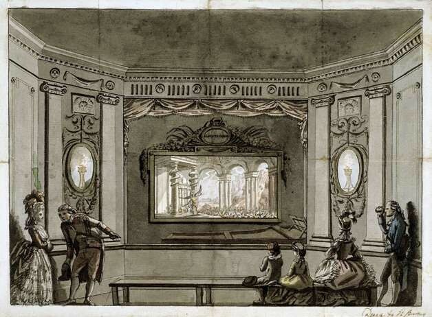 1781年,德·卢泰尔堡离开特鲁里街剧院,在莱斯特广场附近自己的房子里开创了一种全新的体验:他大获成功的“艾多菲斯康”(Eidophusikon)。这个名字取自希腊语中的“幻影”和“影像”,形式类似我们现在所说的沉浸式剧院。该空间可容纳约130人,票价为每张5先令。唯一一幅现存的舞台布置图是由艺术家、插图画家爱德华·弗朗西斯科·伯尼(Edward Francisco Burney)绘制的,画面上一个小舞台(约1.8米宽、1.2米高、2.4米深)被嵌入凹进去的“相框”中,与观众席隔开,前面有一架羽管键琴。在这个“相框”内,“艾多菲斯康”呈现了一系列活动的场景,让观众产生了目睹自然奇观的错觉。德·卢泰尔堡运用了与他在特鲁里街剧院精进的类似技术:复杂多变的灯光效果,层叠布景营造的透视效果,制造活动部件的神奇技术,逼真的音效以及现场音乐。场景包括日出、日落、月升、雷雨、沉船和高耸的地狱。《欧洲杂志》(The European Magazine)将这种体验描述为一种“新的绘画种类”,通过加入时间元素,超越了“普通绘画”。德·卢泰尔堡的“艾多菲斯康”经常被称为现代电影和虚拟现实的鼻祖,当然也预示了即将在19世纪流行的全景画和透视画的出现。