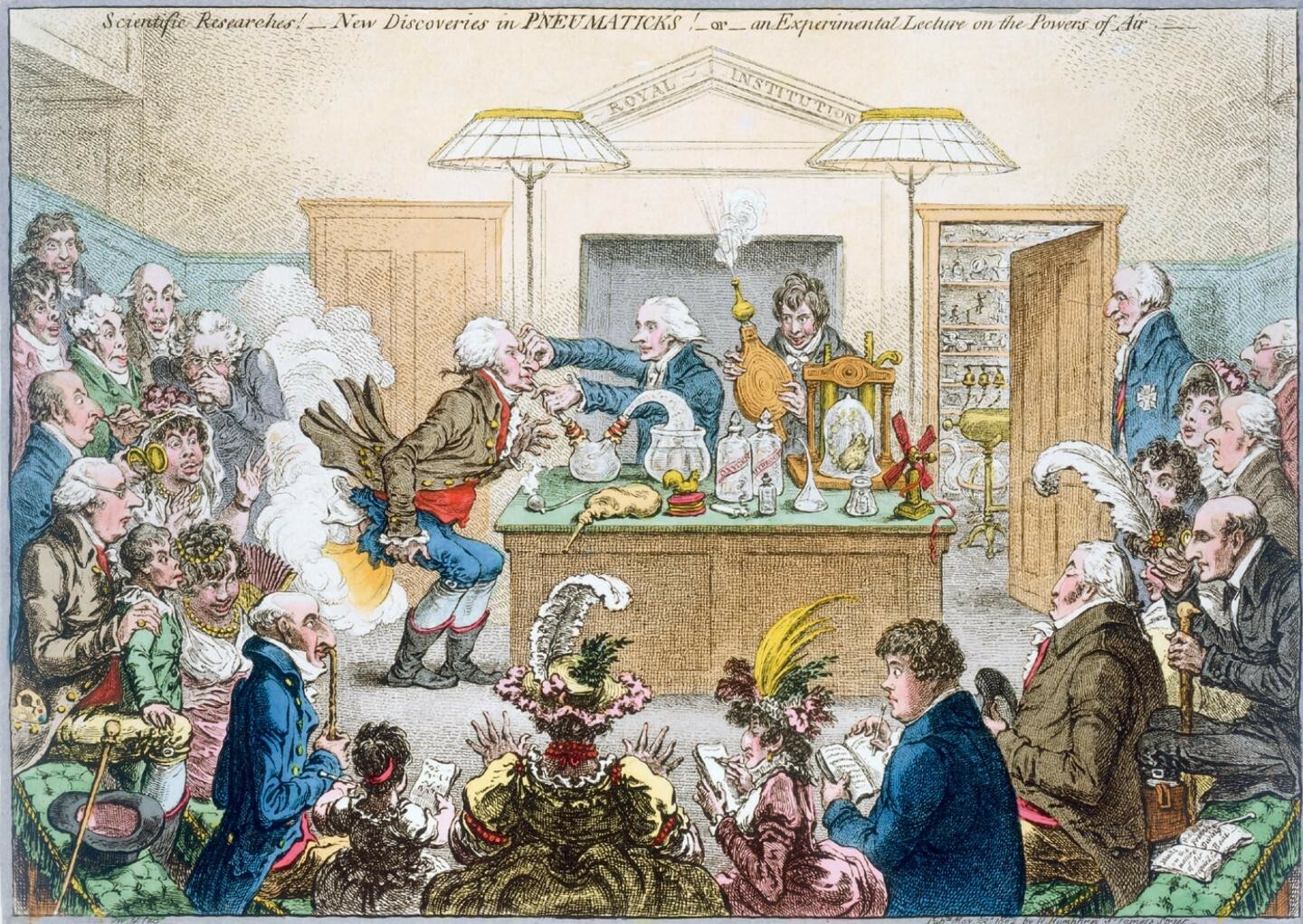 在《科学研究!》中,吉尔雷讽刺了在英国皇家研究院举办的一场关于一氧化二氮的讲座,把在场的每一个人都损了一通。