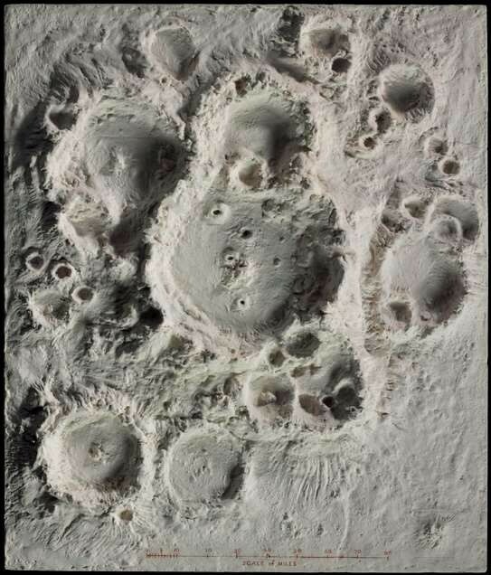 内史密斯根据他的画作,用石膏制作月球表面模型。这里,他将环形山与维苏威火山的大小进行了比较。(p1)