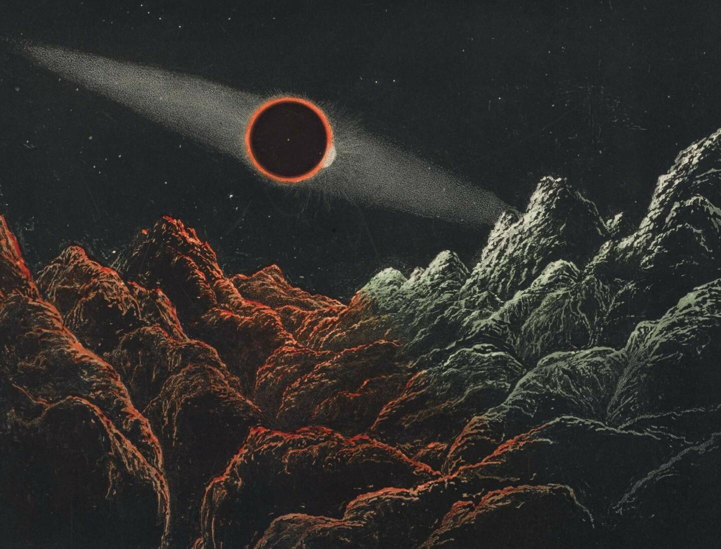 这种即将形成的“天文想象”传统,在《月球》的最后几幅作品中体现得尤为明显。最后三幅图中呈现的视角不是俯视月球表面,而是从月球表面向上看——就好像观看者正站在月球上回望地球。内史密斯用了两个章节来描述这种体验,解释月球与地球的关系。他满怀激情地描写了月球的荒芜景色与地球的葱郁景色之间的不同。他说:“月球让我们了解到一个与我们所处环境完全不同的世界;一个没有水、没有空气、没有生命发展的基本要素,却有条件毁灭生命的星球。”从月球上看,我们地球的海洋“会呈现出(目前可以推断出的)淡淡的蓝绿色,大陆呈杂色……随着环绕地球的白色云带的变化,那些永恒的痕迹也不断发生着明显的变化”。在这里,地球看起来就像一个脆弱、精巧的星球,但包含了人们已经习以为常的各种资源。最后一幅彩色石版画想象了月食期间从月球表面看到的地球:一个黑暗的圆盘,边缘被太阳的光芒包围。这幅作品的基调很快就被科幻小说广泛采用。