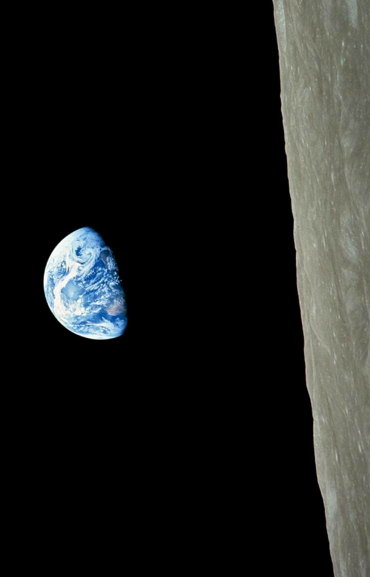 这一切都预示着1968年阿波罗8号的宇航员在月球轨道上第一次看到地球时的反应。地球悬挂在凹凸不平的月球表面的黑色天空中。宇航员威廉·安德斯(William Anders)描述道:
