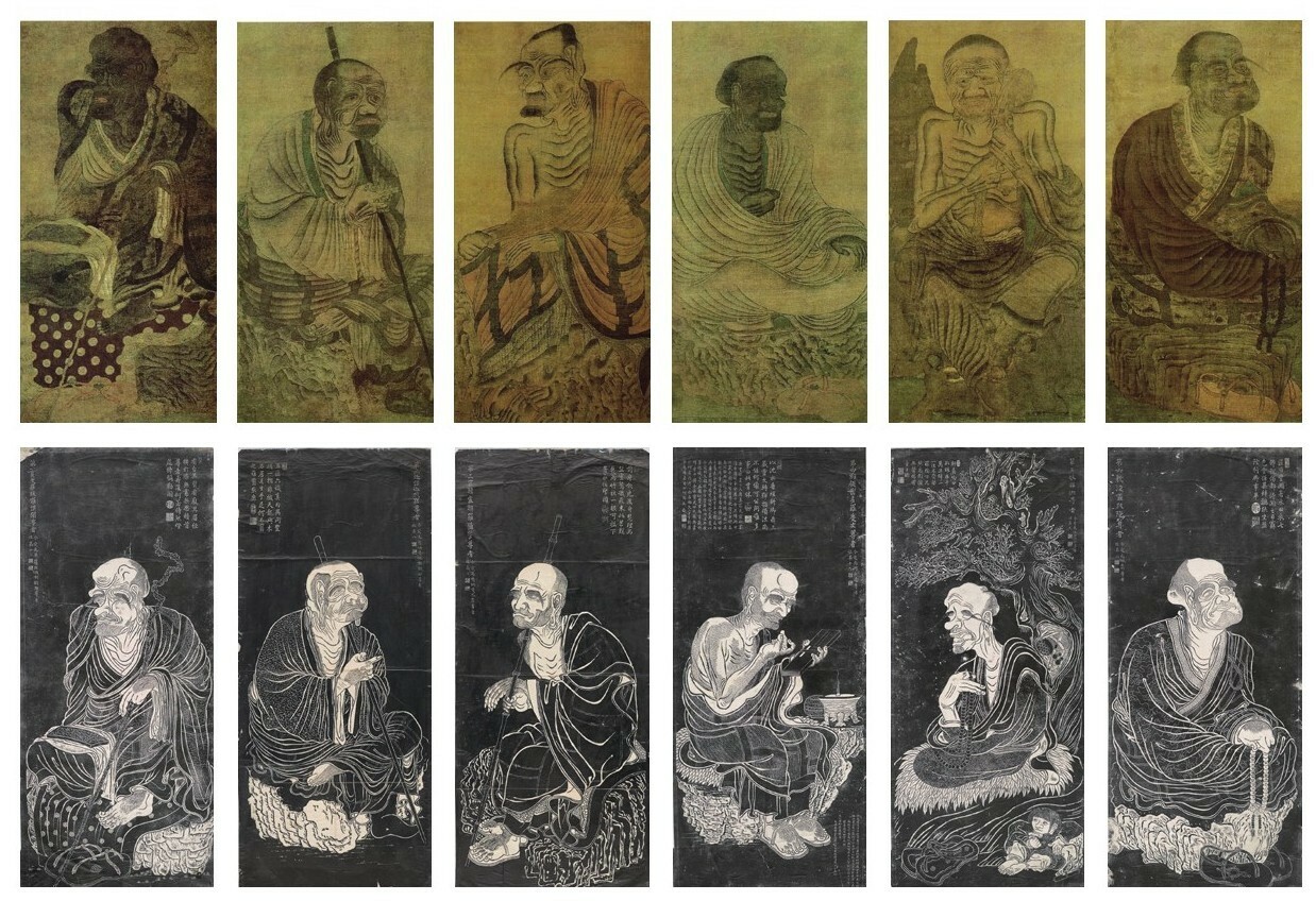 图85 宫内厅本《十六罗汉图》(上)与杭州圣音寺石刻本《十六罗汉图》(下)前六尊罗汉的比较