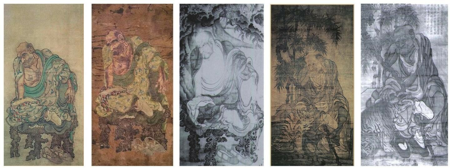 图86 高台寺本《读经罗汉图》、成都麻布本《读经罗汉图》、台北故宫本《读经罗汉图》、高台寺本《伏虎罗汉图》和台北故宫本《伏虎罗汉图》的比较