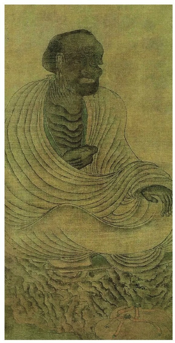罗汉为佛弟子,受佛嘱托,不入涅槃,常住世间,普度众生,受人供养。《益州名画录》记载,贯休所画罗汉,其庞眉大目、朵颐隆鼻等特点,是因梦中所见而得。贯休不仅画罗汉是如此特征,他笔下的释迦弟子也呈现出夸张的造型和各异的形象。这在古代人物画中颇具特点,即使《韩熙载夜宴图》这样具有高超水准的人物画,也会存在形象雷同的现象,而这一点在贯休的绘画中就不存在。