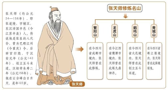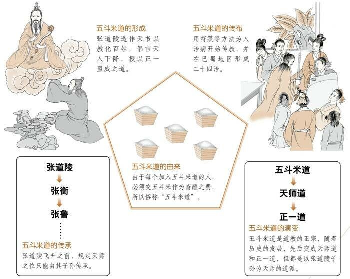 东汉顺帝时,张道陵在巴蜀地区的鹤鸣山(今四川大邑境内)创立天师道,因道教徒尊张道陵为天师,所以称天师道;又因入道者须出五斗米,俗称五斗米道。张道陵吸收当地氐、羌等少数民族宗教信仰,奉老子为教祖,尊为太上老君;以《老子》为主要经典,还信奉《太平洞极经》《太清经》《太玄经》《正一经》和《五斗经》等。