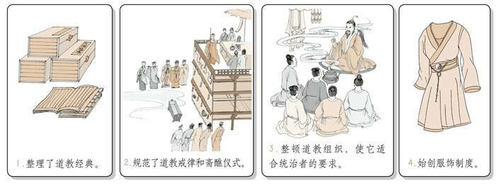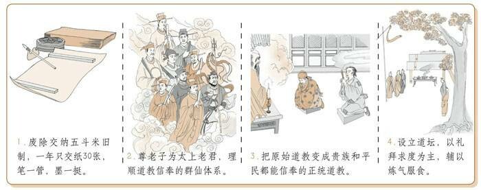 南北朝时期,北魏入主中原建立政权后,鉴于自己是鲜卑族拓跋部,为了消除汉人由于民族隔阂而产生的反抗,实行了与汉族相同化的政策。在对待宗教的态度方面,太武帝对道教非常热心,他支持嵩山道士寇谦之对天师道(五斗米道)进行了改革。寇谦之剔除旧天师道中反映劳动人民利益和愿望的思想,坚决禁绝利用天师道犯上作乱,并废除三张时期的租米钱税制度;整顿组织,加强科律;增订戒律和斋醮仪范。经改造后的天师道,由一个民间宗教,变成了符合封建统治阶级需要的宗教,被称为北天师道或新天师道。