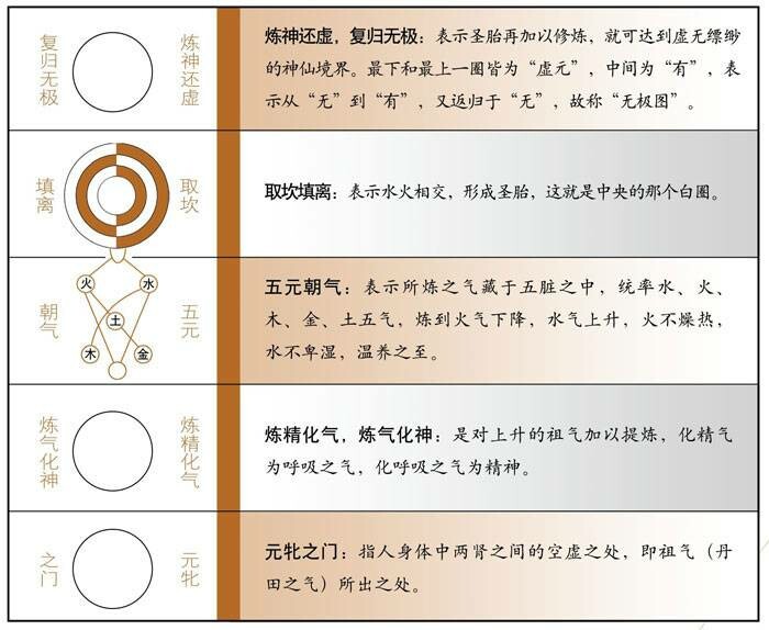 《无极图》:《无极图》是陈抟参悟《易经》和《老子》等书所创制的,阐述了内丹修炼的过程,以精为基础,以精和神凝合为要旨,以引气运行为手段,明确了内炼的朴素唯物观,成为后代内丹繁荣的直接根源。陈抟之后,内丹分为南北二宗,即王重阳所创的北宗和张伯端所创的南宗。