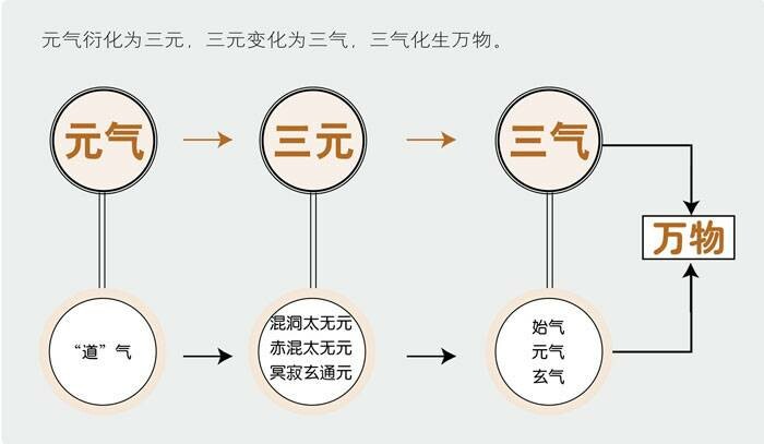 三洞宗元,是以“三元”为宇宙混沌之始。“道”气衍化为三元,即第一混洞太无元;第二赤混太无元;第三冥寂玄通元。由三元变化为三气,即始、元、玄三气,再由三气化生万物。其造化开辟的过程是,混沌之前,是元气之始;元气运行,而后有了天地;再由始、元、玄三气化生万物。