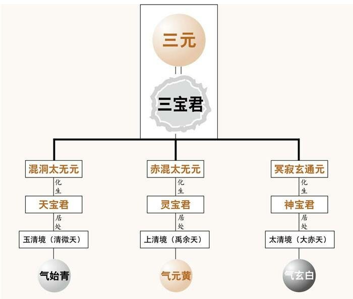 三洞宗元作为“道”化万物的信仰宗元,还有其更重要的一面,就是三元即三宝君。第一是从混洞太无元化生的天宝君,第二是从赤混太无元化生的灵宝君,第三是从冥寂玄通元化生的神宝君。三宝君分别治于三清境,故三宝又称三清。天宝君治在玉清境,即清微天,其气始青;灵宝君治在上清境,即禹余天,其气元黄;神宝君治在太清境,即大赤天,其气玄白。而三元皆本同道气,所以,三宝君的名号虽殊,却本同于一。