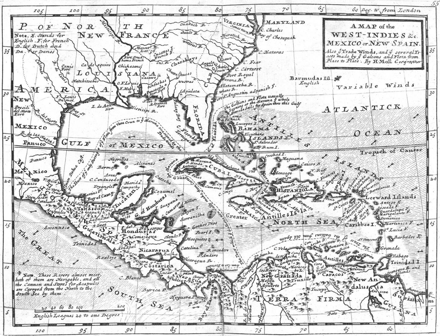 图7 《西印度群岛、墨西哥或新西班牙地图》。此外,还可以从图中有些地方看出西班牙大帆船和商船从一地去往另一地的贸易风向和航海路径。1732年,影响力颇大的保守党派地理学家赫尔曼·摩尔绘制了这幅地图,1736年在伦敦刊印。这幅地图是赫尔曼·摩尔的杰作,它将西印度群岛描绘成一个具有巨大商业潜力的地区,处于发展中的大英帝国的核心。这幅地图也有助于英国海盗掠夺西班牙船只。