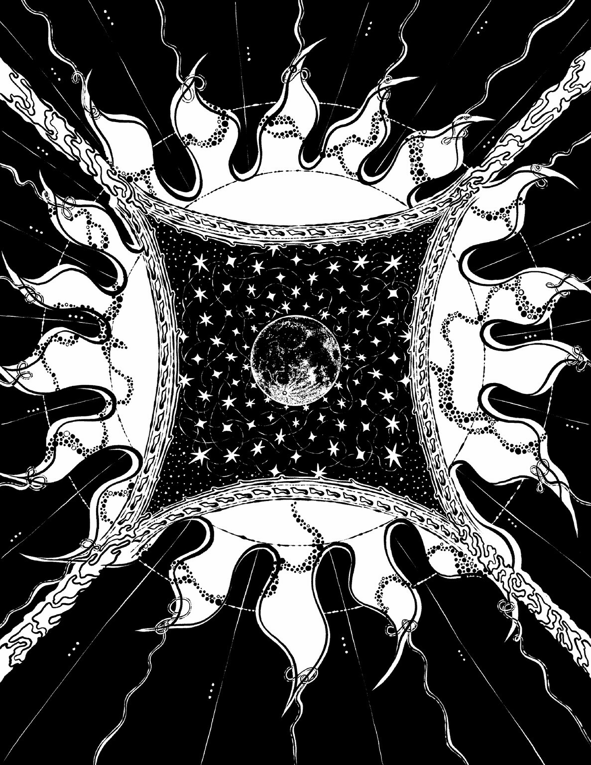 在巴塞罗那高迪设计的桂尔宫里,有一个塔状的入口大厅通向各个房间,此处给人的印象日夜迥异,白昼的概念以一种奇异的方式消弭了。日间,穹顶上的阳光变为星空满月,熠熠生辉;夜间,此景不在,星空消失源于室外夜幕降临,顶上的孔洞没有被照亮。这一过程是不可逆的:白昼可变为黑夜,而黑夜却变不了白昼,因为黑夜来自宇宙,而白昼来自世俗人间。穹顶上的一个圆形孔洞及其周围的小孔让阳光投射进来,造成一种室外是黑夜的感觉(蓝色的天顶),圆月高挂(顶上的大孔洞)、群星环绕(穹顶散布的一系列小孔)。所有这一切均来自世俗人间的太阳。高迪仿照创世记,在他的城堡里创造了一个小宇宙,与我们身处的这个大宇宙紧密交融,恰似人内心的小宇宙同外部的大宇宙相交相融。