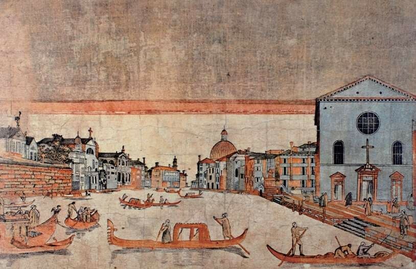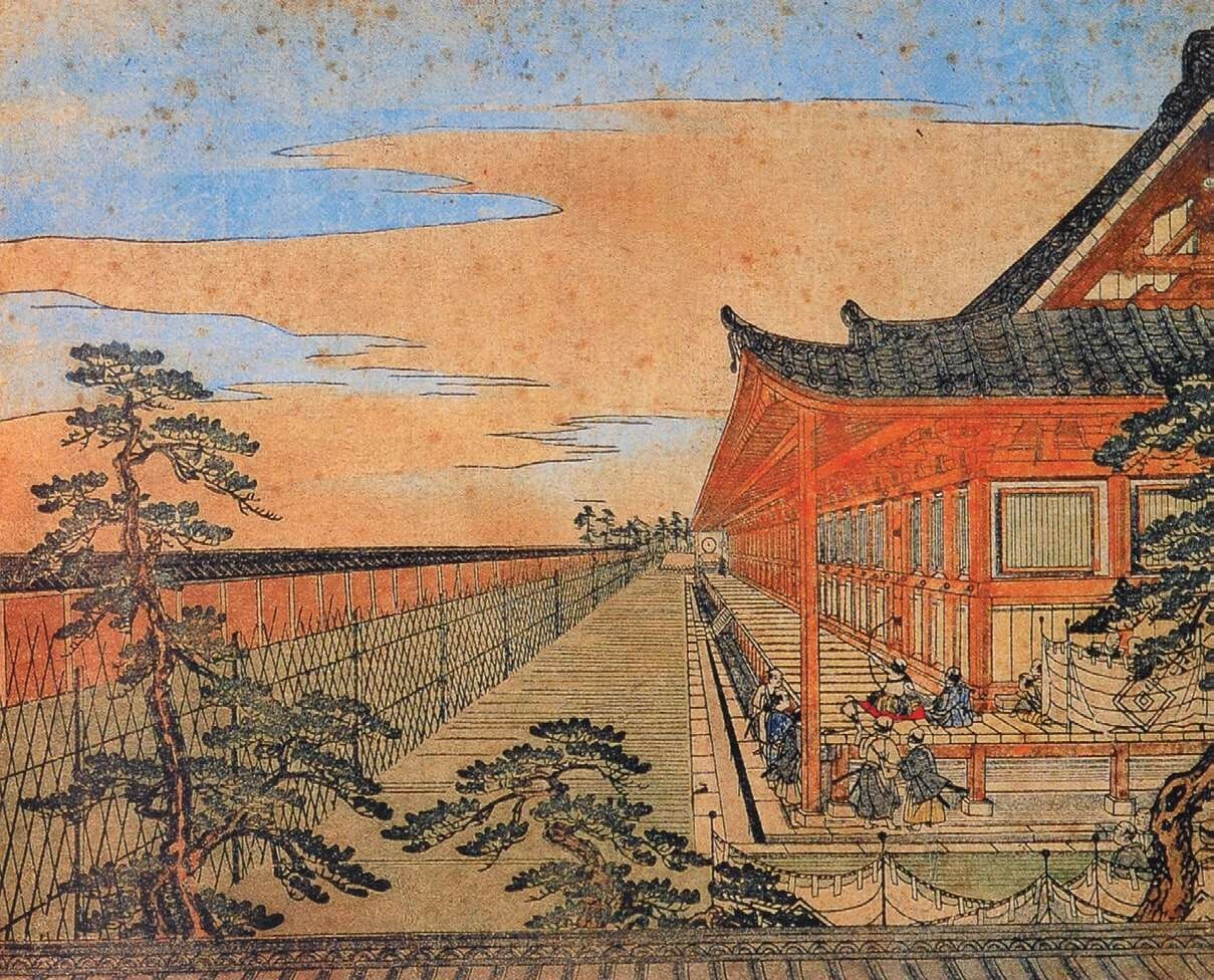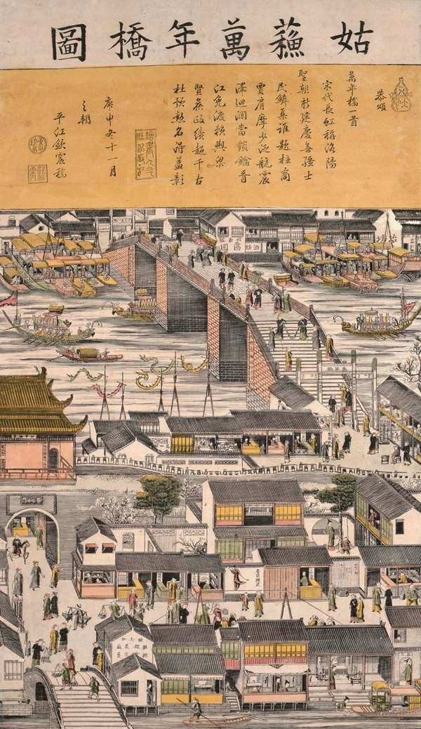 17世纪下半期到18世纪上半期,在长崎居住着许多旅日苏州人,他们保留着家乡过年的习俗和对本土艺术的眷恋,因此“姑苏版”年画首先通过居住在长崎的苏州人传入日本,许多画工、雕刻工和拓印工带着工具材料到长崎,直接在当地制作“姑苏版”年画,也深受日本民众的欢迎。同时,日本通过长崎港与中国进行有限的贸易活动,也有姑苏版年画以这个渠道进入日本。但和其他货物相比,其数量显得微乎其微。这些来自中国民间的木版年画,被江户画师们视为珍品,他们不仅从画面上间接地接触到了西方绘画的明暗法和透视法,同时也感受到市民文化的活力。浮世绘大量采用从长崎传入日本的“姑苏版”表现手法,如空间透视法、铜版画排线刻法等。可以说苏州版画帮助日本人进行了“视觉训练”。“姑苏版”年画越过姑苏城,还远渡重洋流传到欧洲,对世界产生了影响。
