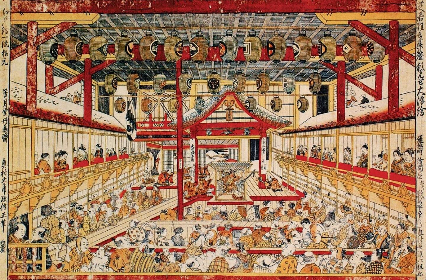 浮世绘风景画的真正发展始于“浮绘”,即以线描的方式模仿西方绘画追求空间深度表现的绘画的总称。对习惯了平面表现的日本人来说,画中景物在放射状线条的作用下,犹如漂浮起来一般。同时由于远处景物的凹陷效果,有时也被称为“凹绘”。当时浮绘的主题是歌舞伎剧场内部以及吉原的室内空间,即使表现室外空间也多以吉原与歌舞伎町的街道为对象,因此主要集中在对建筑物的表现上。它们多由直线构成因而在表现技法上相对容易,当时的江户画师们尚未掌握以不规则曲线、曲面构成的山水风景等复杂透视。