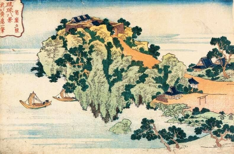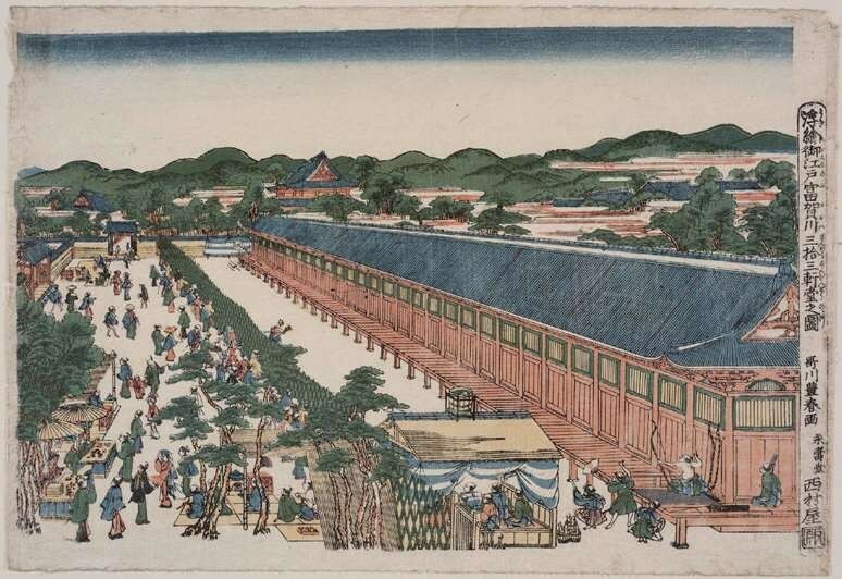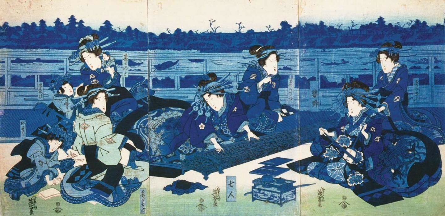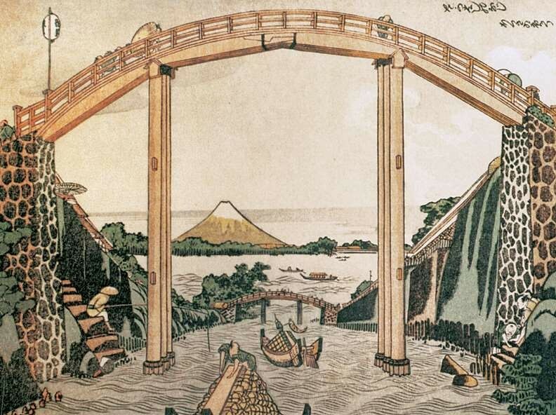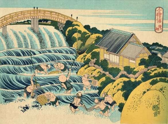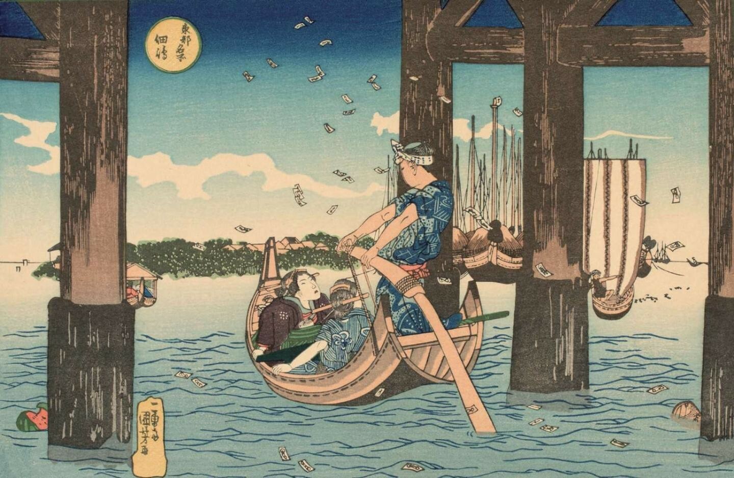 歌川国芳以武者绘闻名,他的风景画也很有特点。《东都名所》系列共十幅,巧妙的空间构成与透明清爽的色彩感觉令人耳目一新,其中《佃岛》一幅是这个系列的代表作,体现出后期浮世绘的写实特征。画面前方的佃岛位于隅田川河口,原本是个小岛,后来由于填海造地与北部的石川岛连接。江户时代,摄津国西成郡佃村的渔民居住在这里,作为“佃煮”的原产地而闻名。佃煮是用酱油和砂糖煮成酱香的日式料理,主要原料是小鱼、蛤仔等贝类和海带等海藻类。桥下正在摆渡的小木船因形同猪牙被称作猪牙舟,船头细长而尖,没有船篷,船身细窄易摇晃。因此摇橹的推进力被充分发挥而速度快,方便在狭窄的河流里运行,多在江户的内河使用,因往来浅草山谷中的吉原游客经常乘坐,也被叫作山谷舟。从桥上飘落的是祭祀水难者的施食纸札,河里漂浮着没吃完的西瓜和其他杂物,画面细节充满了生活气息。